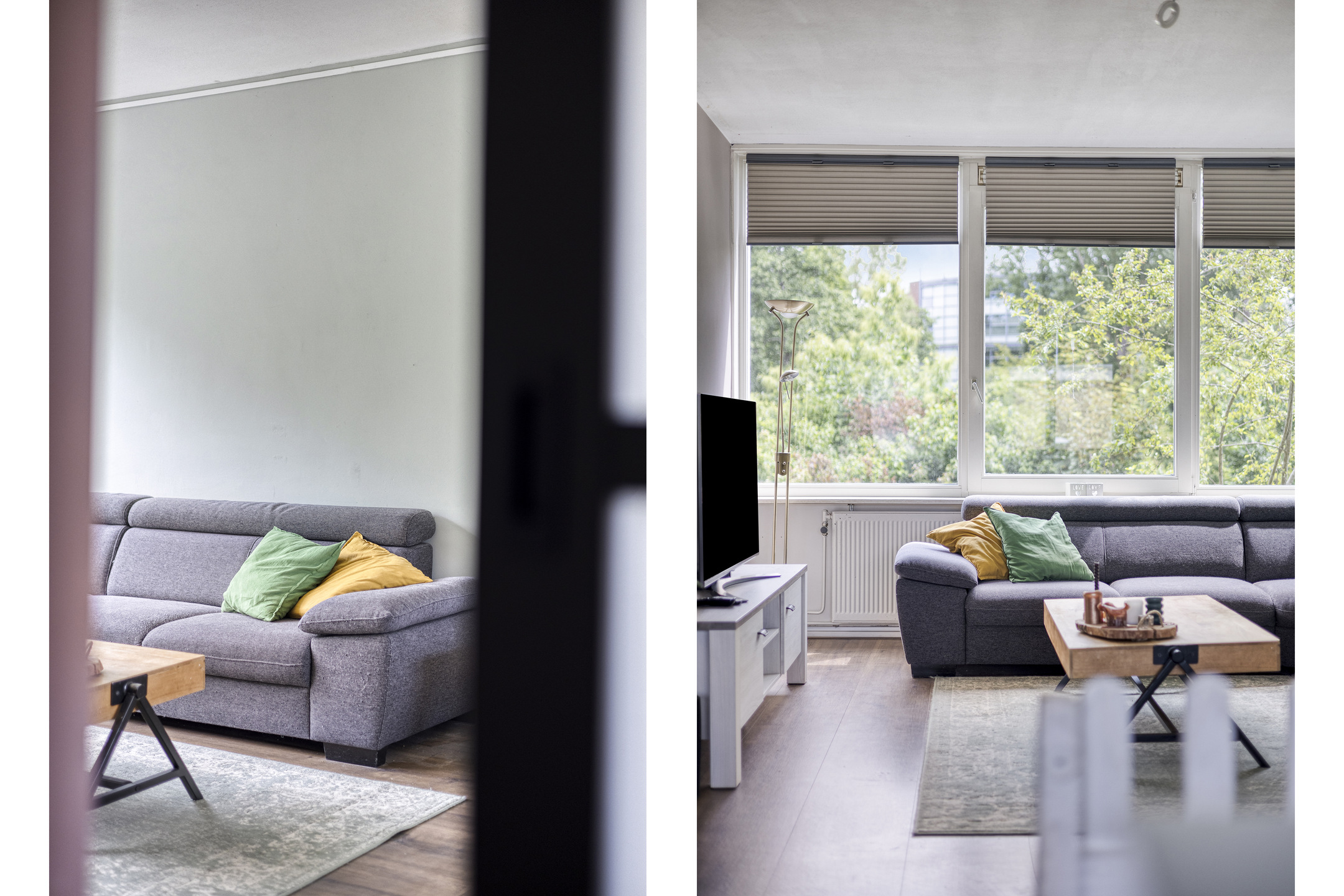 The communal entrance gives access to the building. Here you’ll find the mailboxes, intercom panel, storage units, and stairs to the apartment. Upon entering, you immediately step into the dining area, where you’ll instantly notice the pleasant atmosphere of the home. The dining area also provides access to the first cozy balcony with a view of the park.