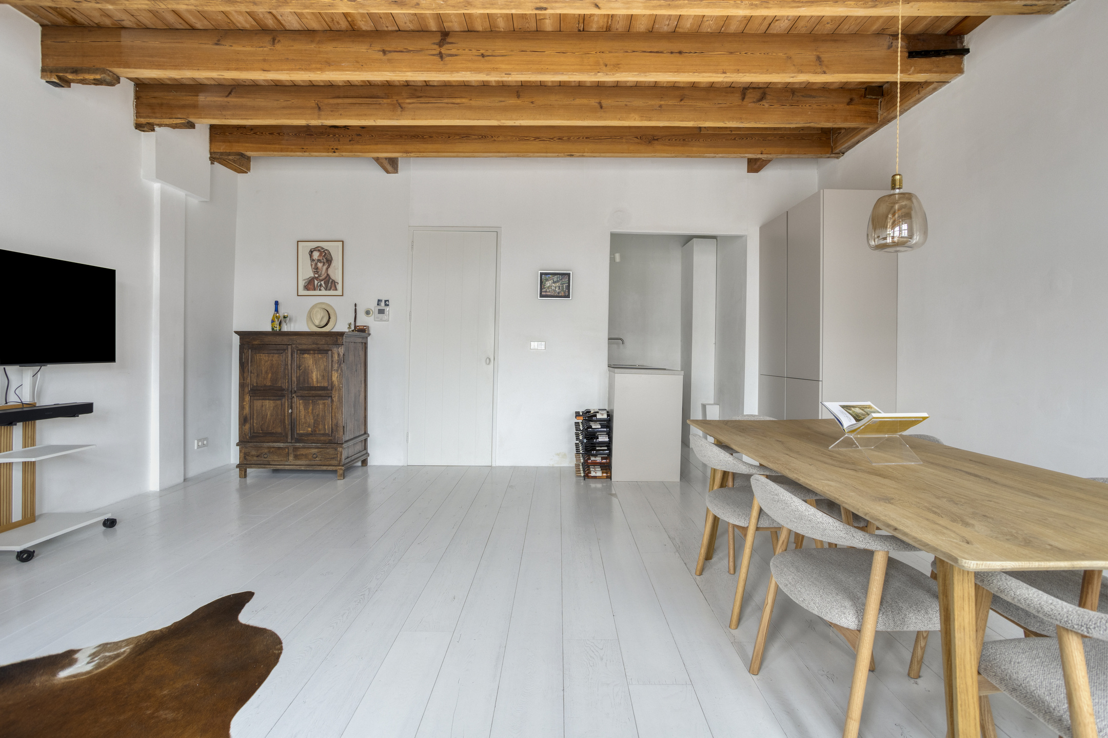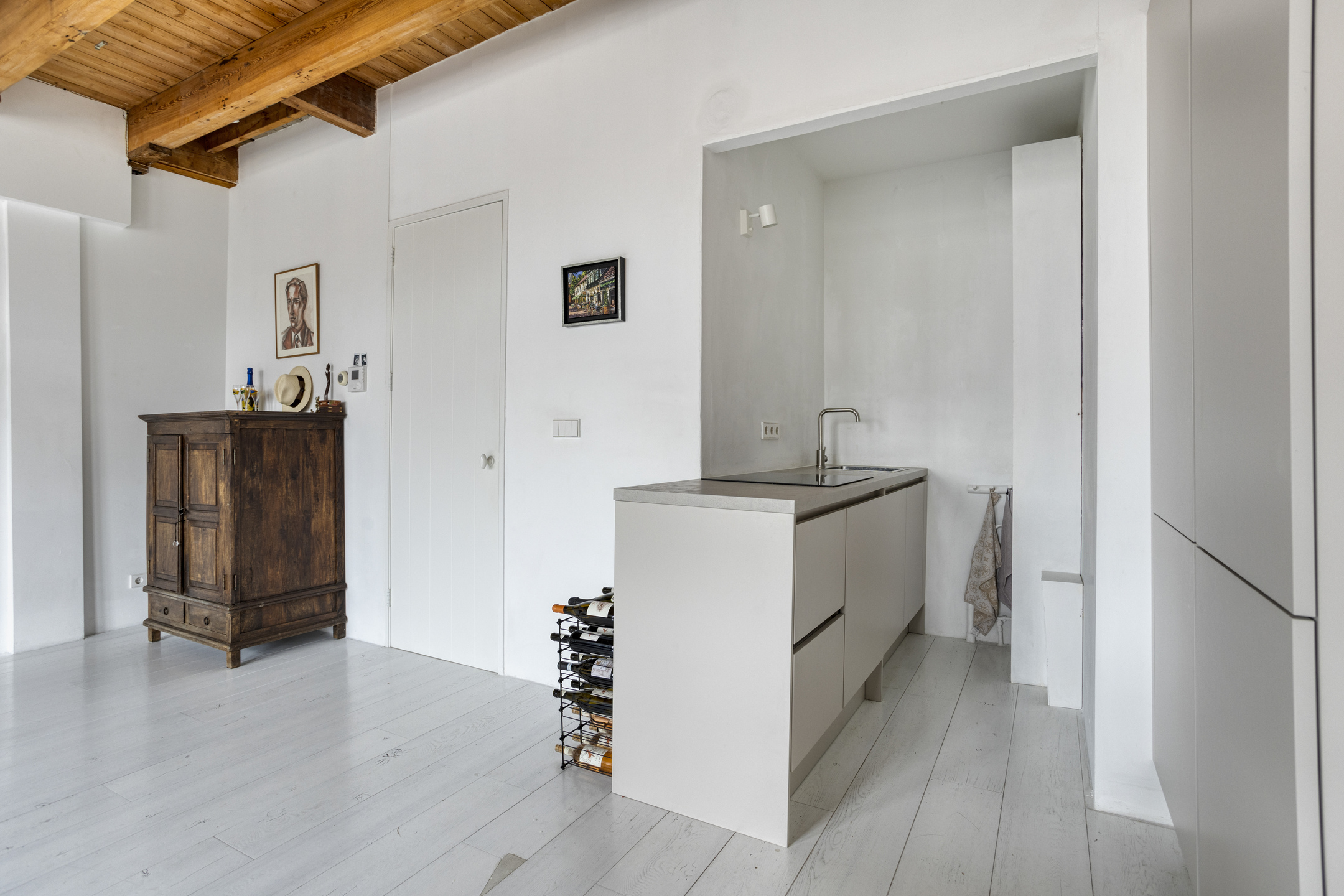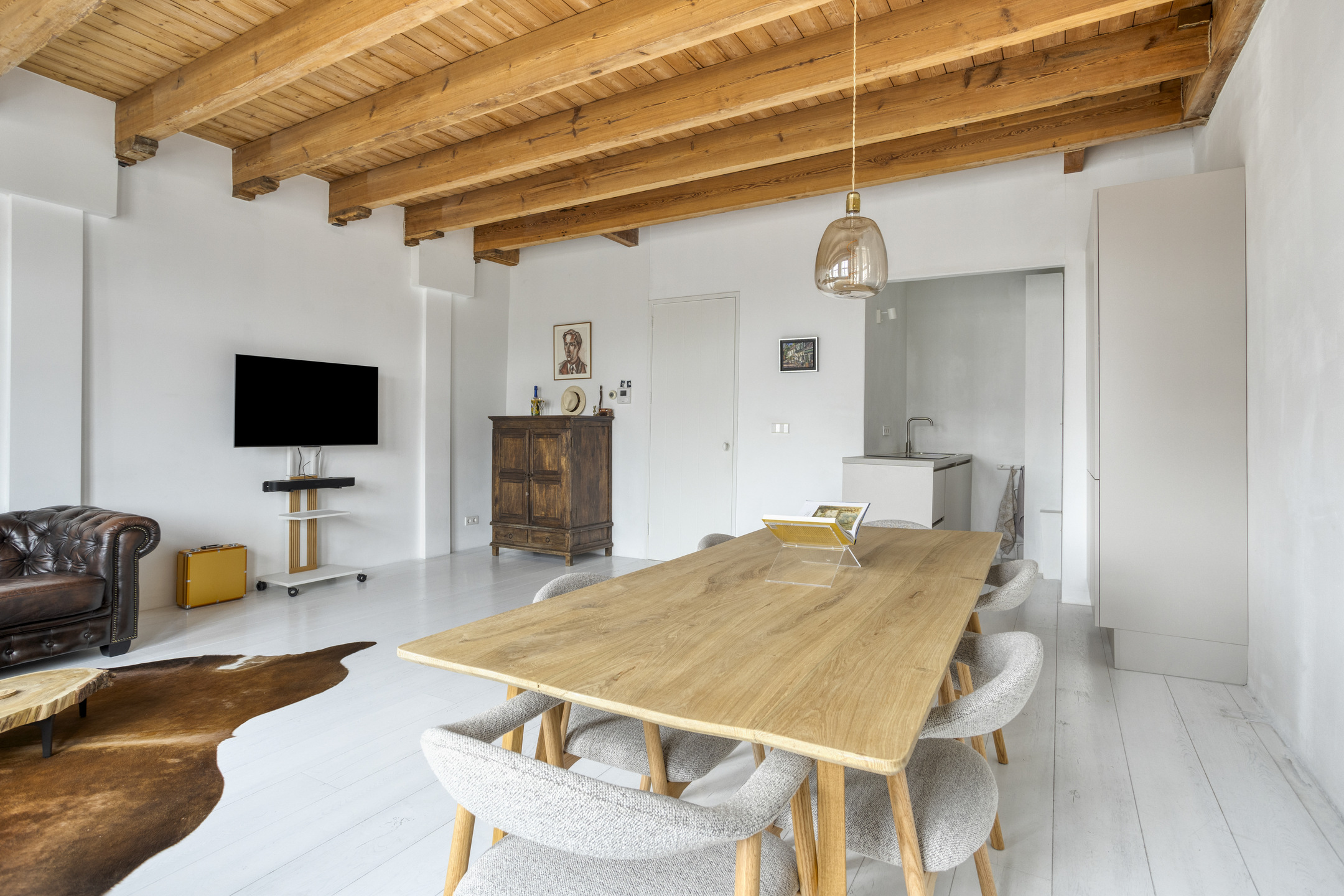 The apartment (68 m²) is smartly designed and equipped with all comforts. Through the entrance and staircase or elevator, you reach the spacious living room, where the original wooden beams and tall windows immediately catch the eye. The natural light and canal view create a unique living experience. The modern open kitchen (2024) connects seamlessly and is equipped with – among others – a steam oven, fridge-freezer combination, dishwasher, oven-microwave, induction cooktop, and two large storage cabinets.