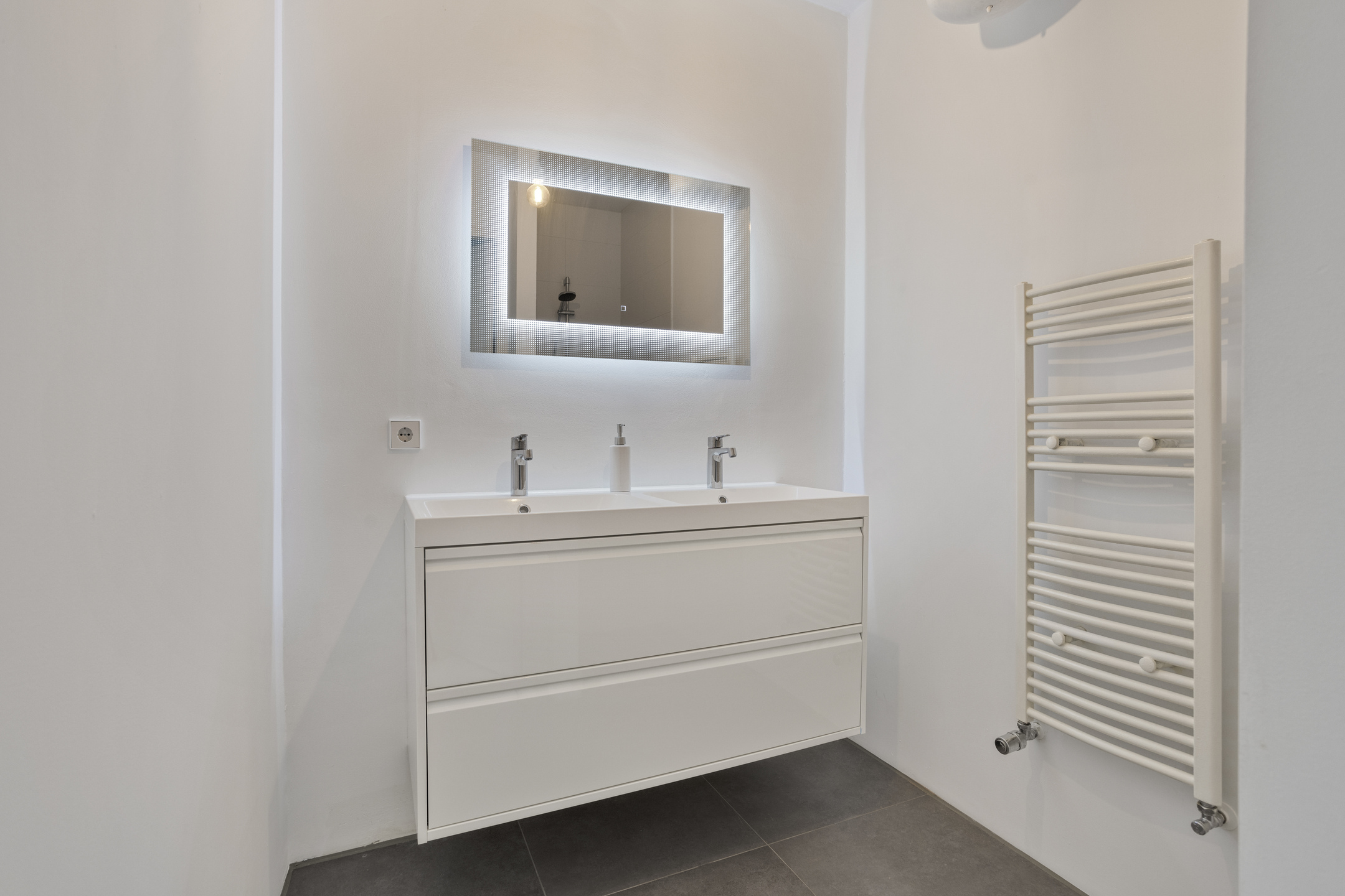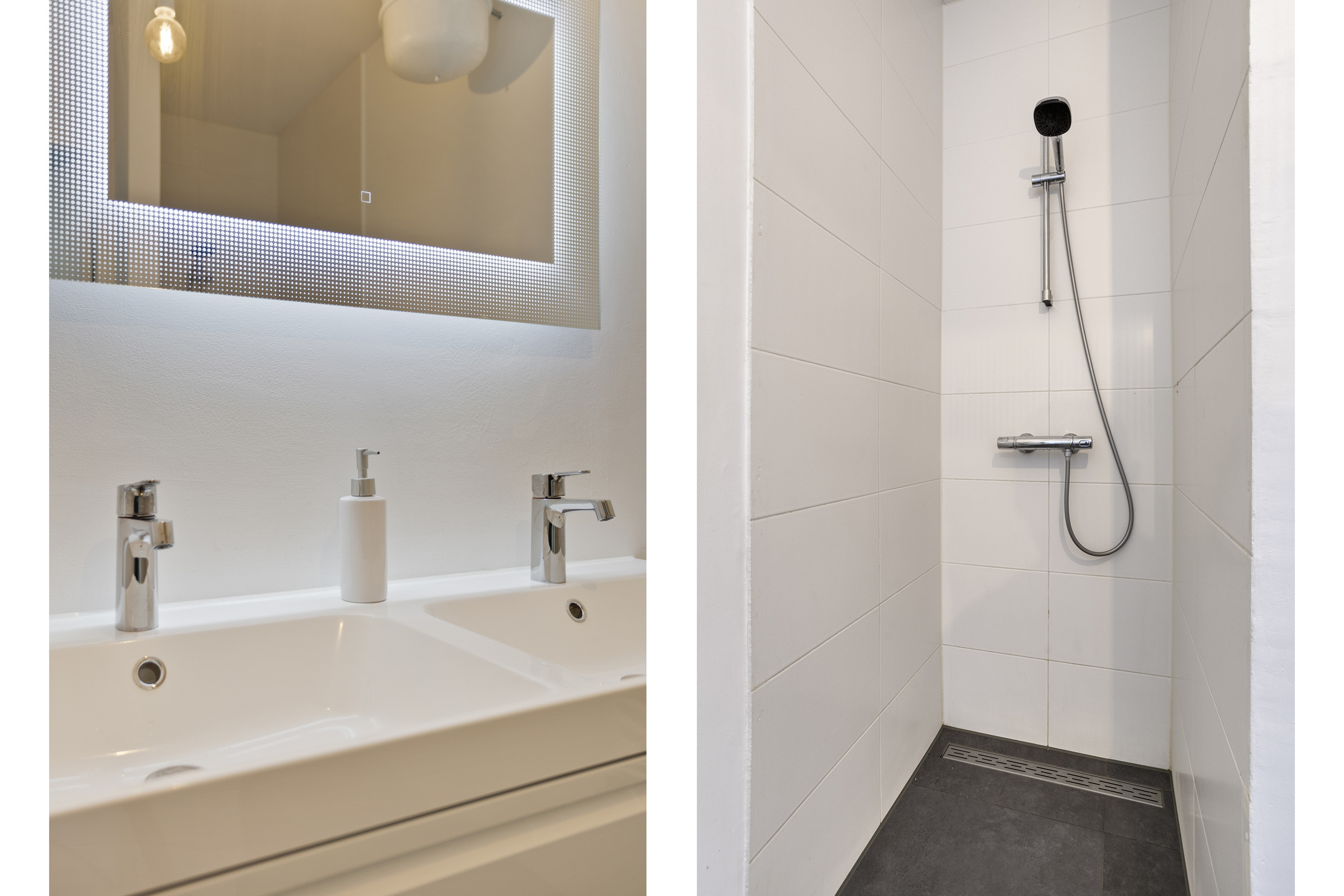 From the entrance hall, you access both the bathroom and the two well-proportioned bedrooms. The bathroom is modernly finished and features a walk-in shower and double washbasin. The separate toilet follows the same contemporary design, and a practical storage space is centrally located in the hall. Both bedrooms feature tall windows with sunshades. The entire apartment is neatly finished with a wooden floor WITH underfloor heating, smooth plastered walls, and wide window sills that emphasize the monumental character.