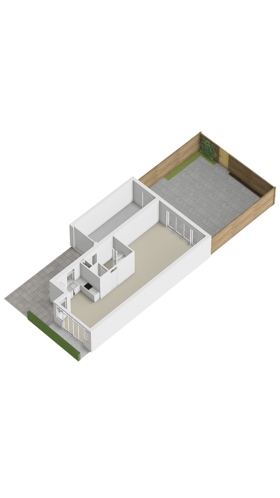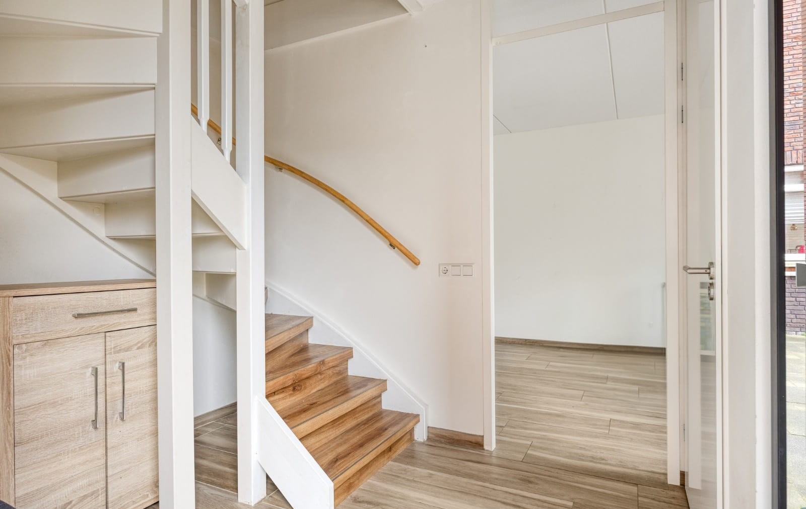 Through the private driveway with space for one car, you reach the front door. The spacious entrance hall provides access to the meter cupboard, the toilet, and the generous living room with open kitchen. Thanks to the French doors with side windows spanning the full width, the bright L-shaped living room is a pleasant living space. From the living room, you step directly into the large back garden. The living room features a neat PVC floor with underfloor heating. The modern open kitchen is equipped with various built-in appliances, including an induction hob, dishwasher, carousel cupboards, and abundant storage space.