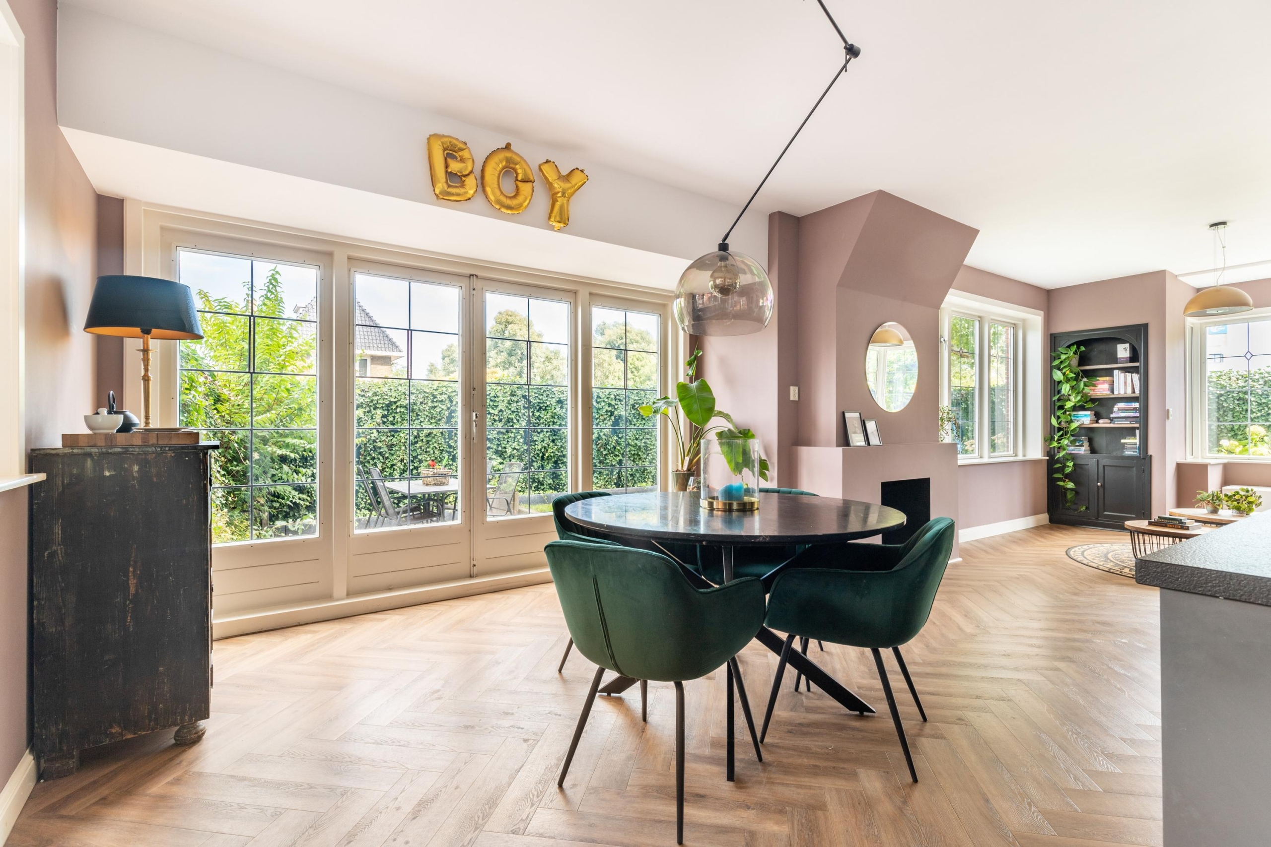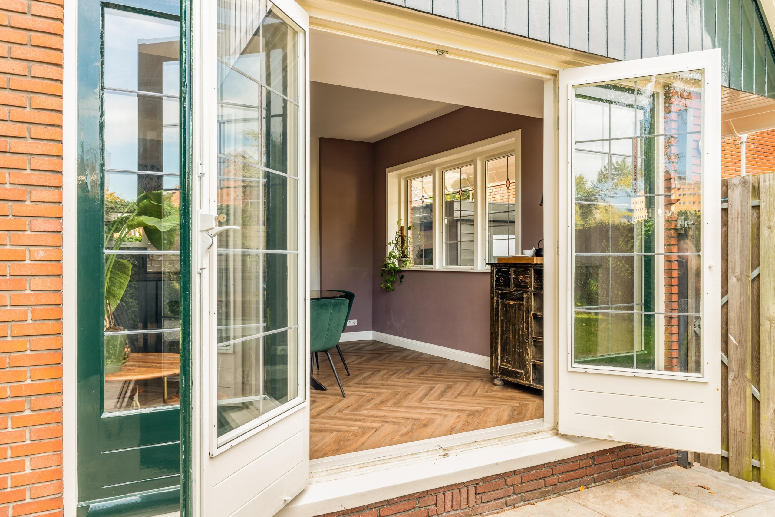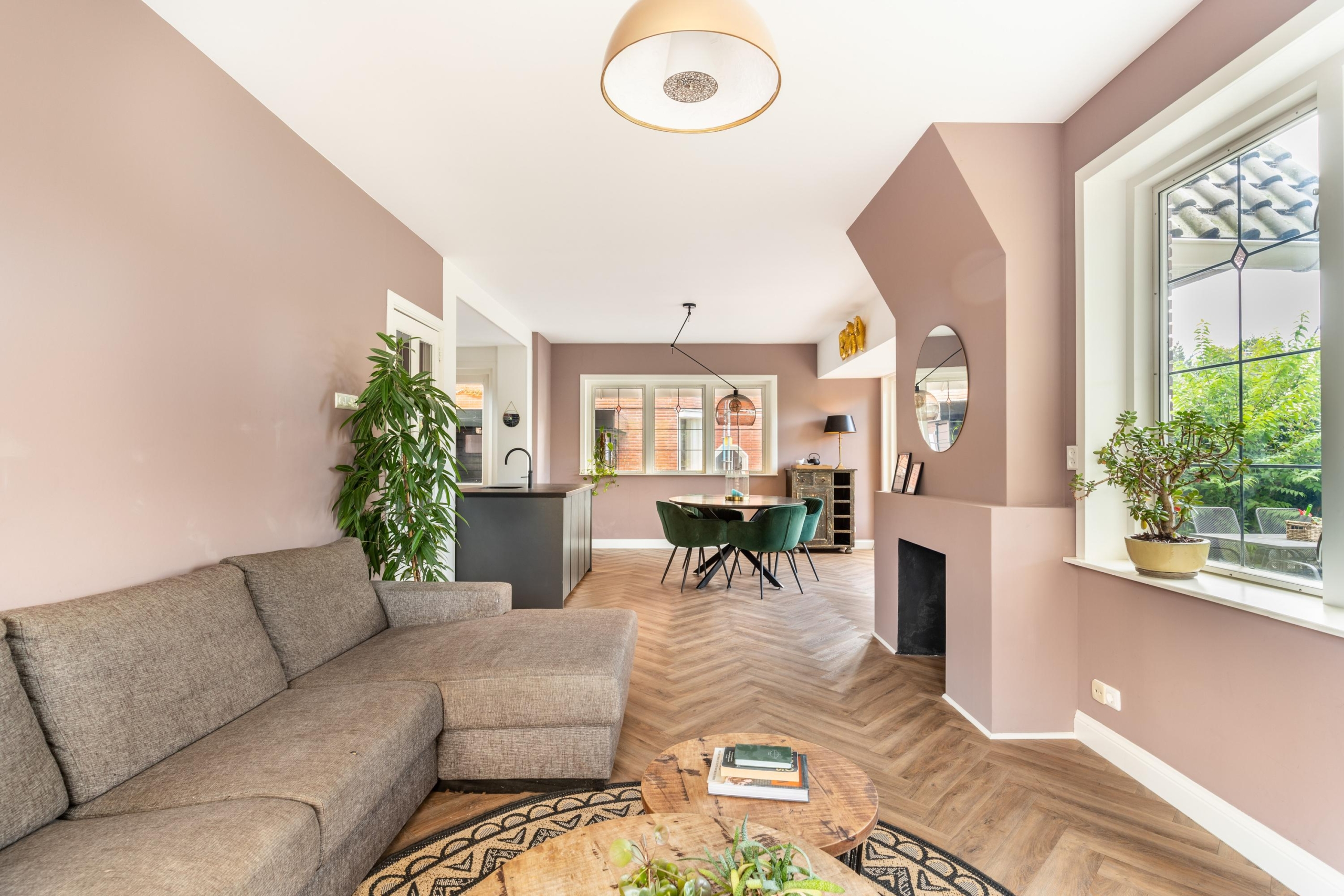 Through the well-maintained front garden and characterful entrance hall with wainscoting and stained-glass windows, you enter a spacious living area. The living room is bright and inviting thanks to the renovation and modernization in 2020, featuring a beautiful herringbone PVC floor with underfloor heating. The authentic fireplace adds extra character, while French doors open to the large backyard.