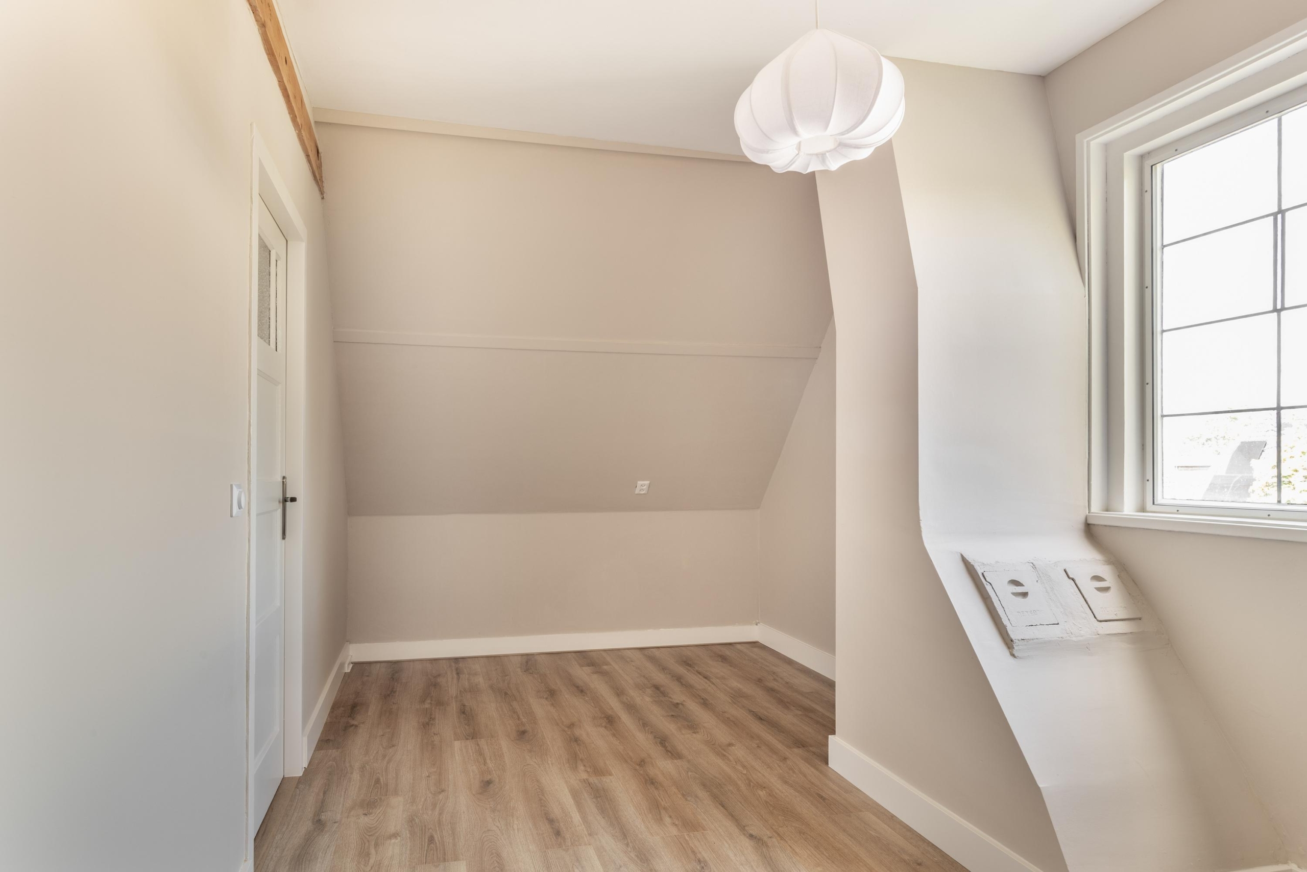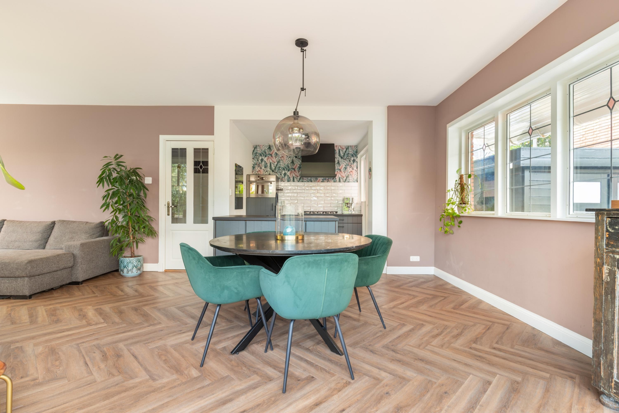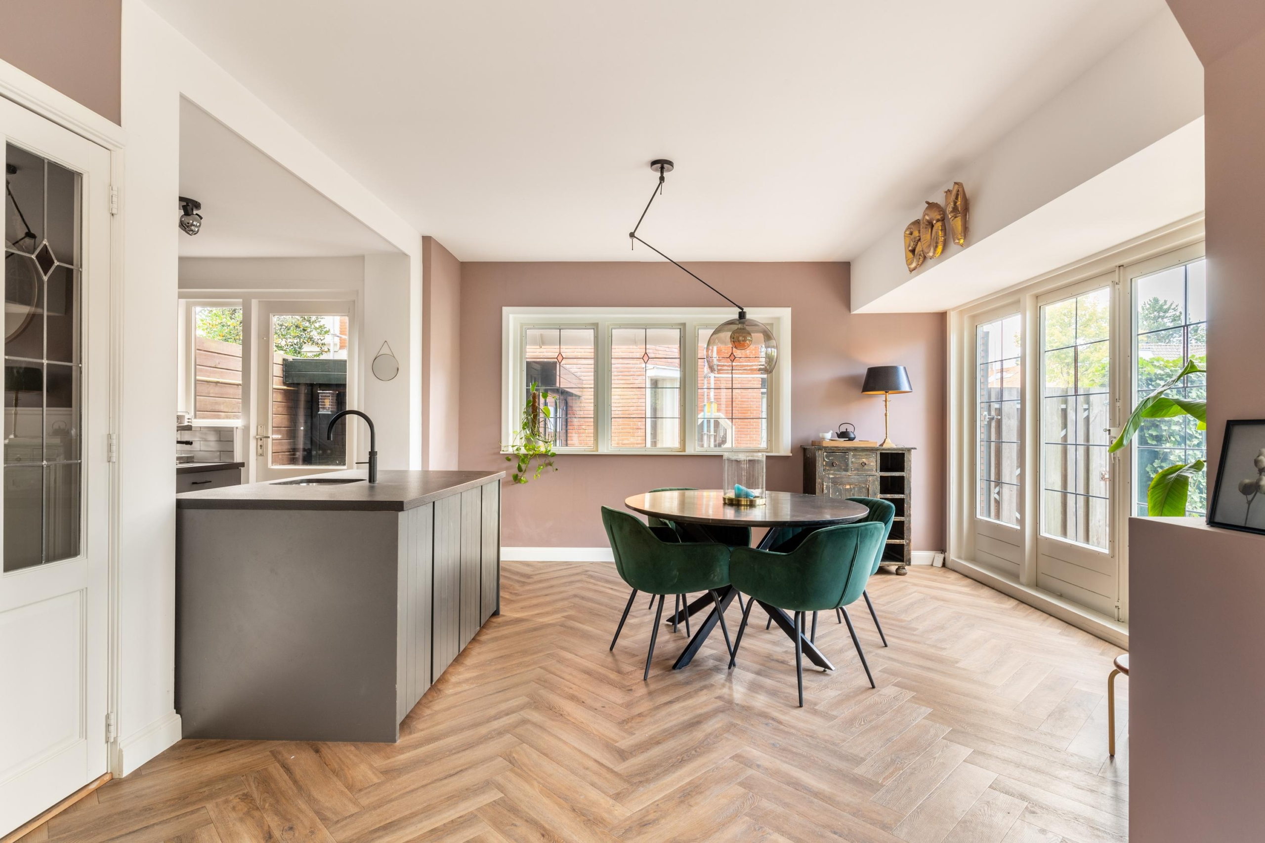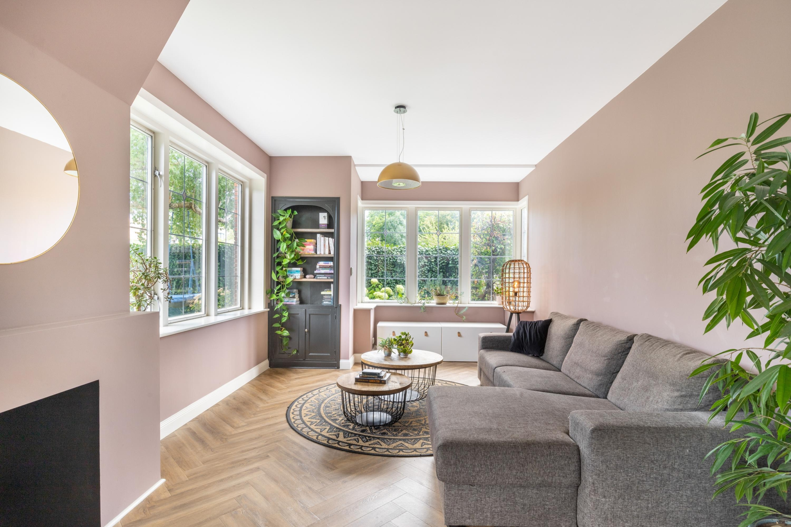 Through the well-maintained front garden and characterful entrance hall with wainscoting and stained-glass windows, you enter a spacious living area. The living room is bright and inviting thanks to the renovation and modernization in 2020, featuring a beautiful herringbone PVC floor with underfloor heating. The authentic fireplace adds extra character, while French doors open to the large backyard.