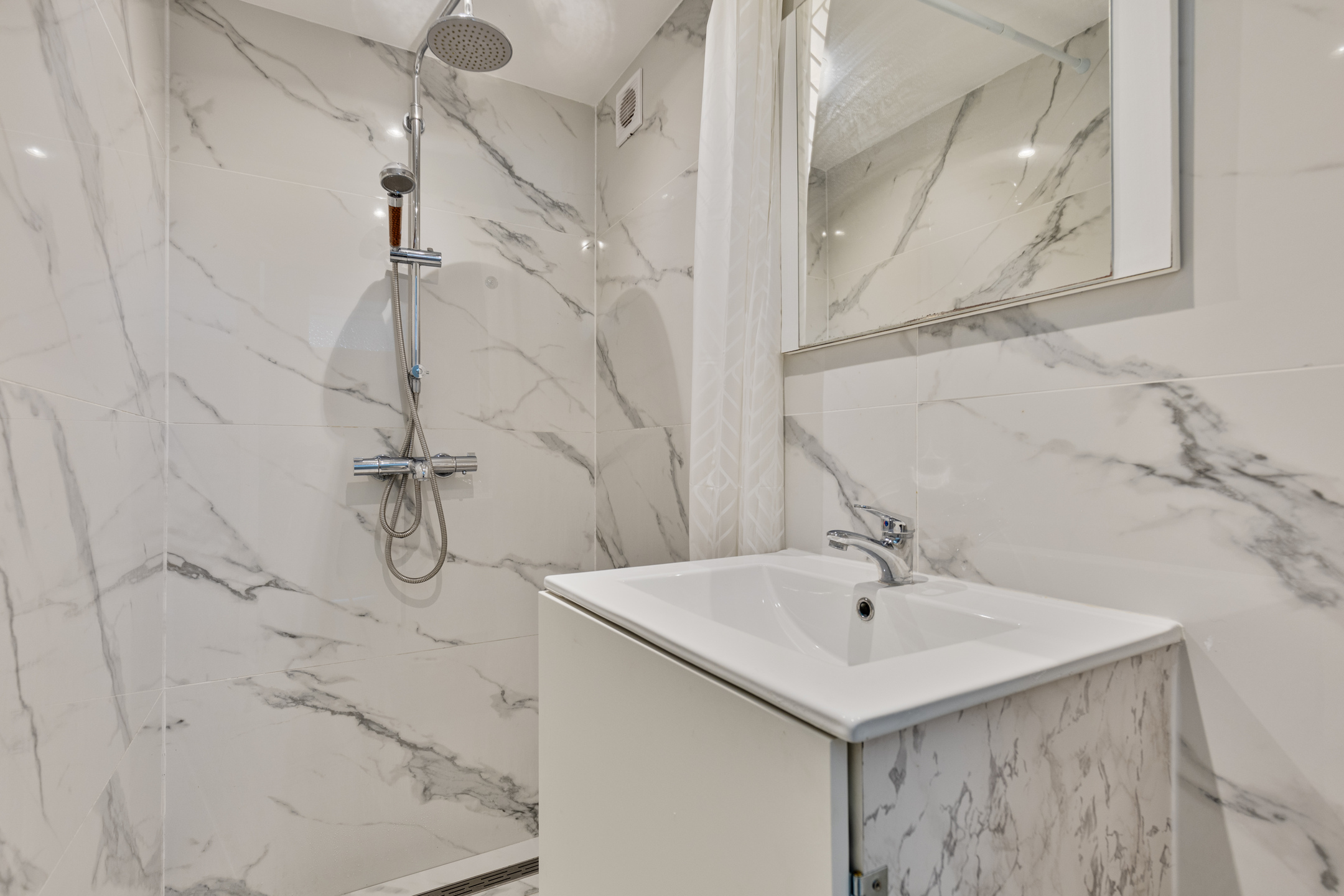 The home has two bedrooms. The master bedroom is spacious and comfortable, while the second bedroom is perfect as a children's room, study, or guest room. The bathroom has been recently renovated and features modern facilities such as a rain shower, wide sink with mixer tap, and a mirror cabinet with storage space. The separate toilet has also been renovated in the same style.