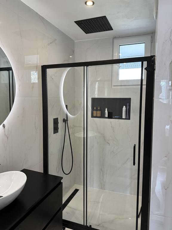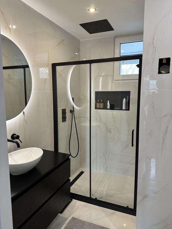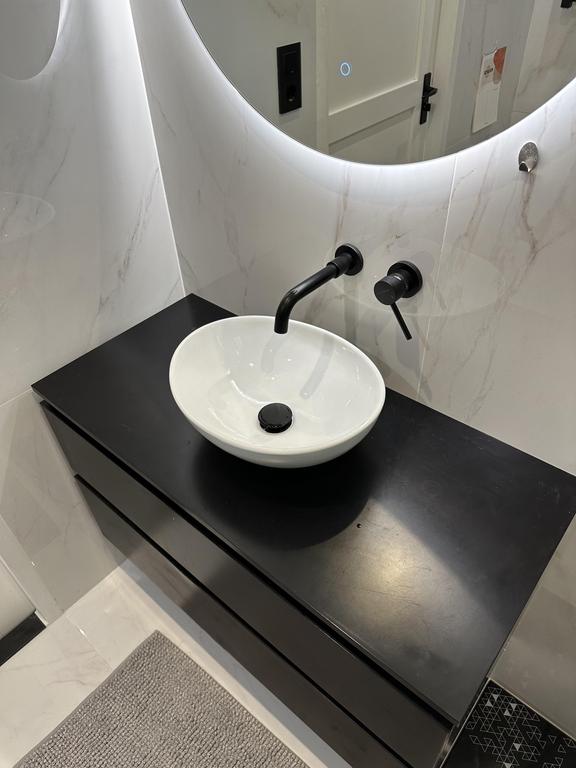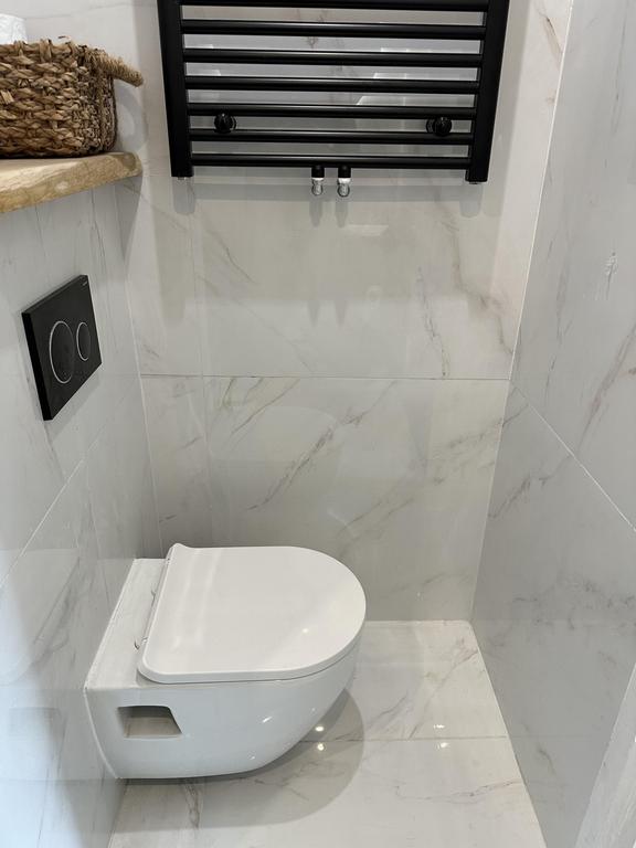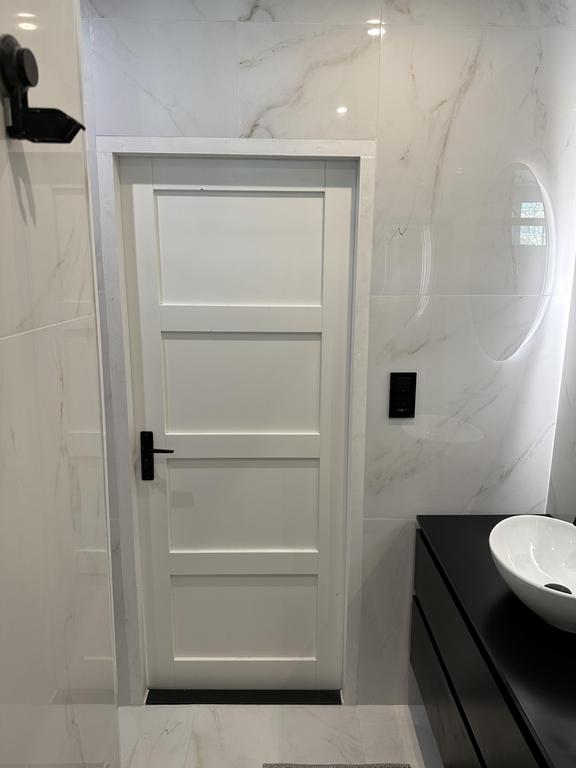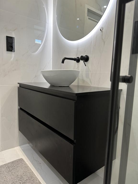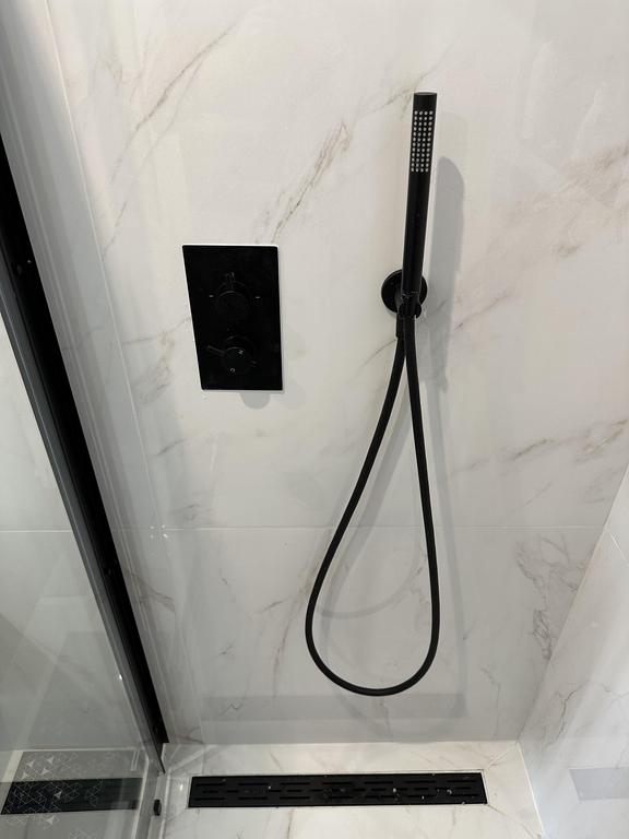 Also on the first floor, you'll find the bathroom, recently renovated in a modern style with white marble-look tiles and matte black accents. It features a walk-in rain shower and a stylish washbasin. There is also a separate toilet and a utility room with connections for a washer and dryer.