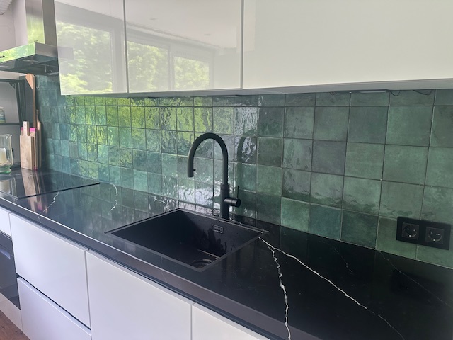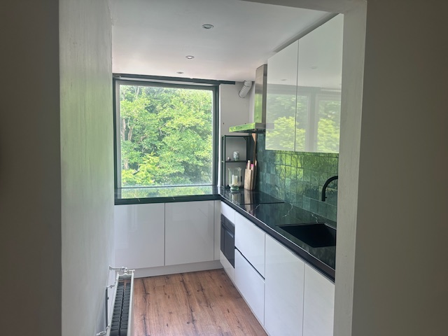 On the right side of the hallway, you'll find the sleek and modern kitchen, finished with a black marble countertop. The kitchen is equipped with an induction cooktop, combi-oven, and all essential built-in appliances.