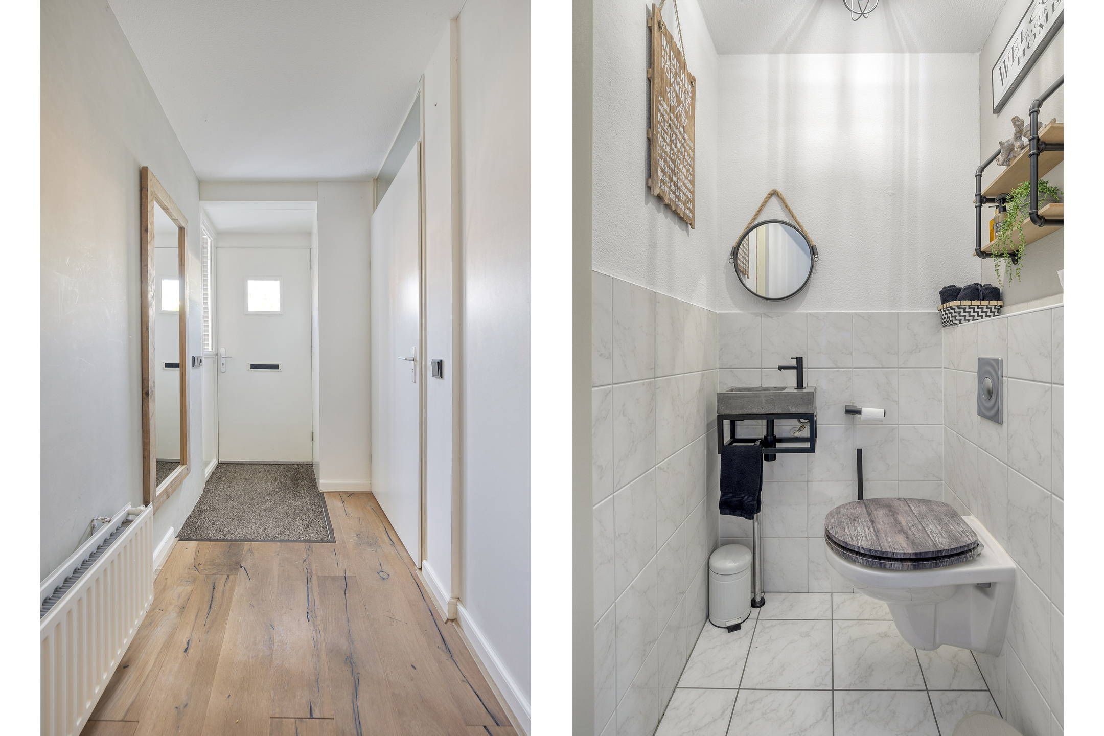 The staircase in the hallway leads to the first floor, where you’ll find three spacious bedrooms and a modern bathroom. The bathroom is elegantly finished with full-height tiling, a bathtub, a walk-in rain shower, a second toilet, and a double washbasin unit. The two bedrooms at the rear of the house are ideal as children’s rooms or home offices. The largest bedroom is located at the front.