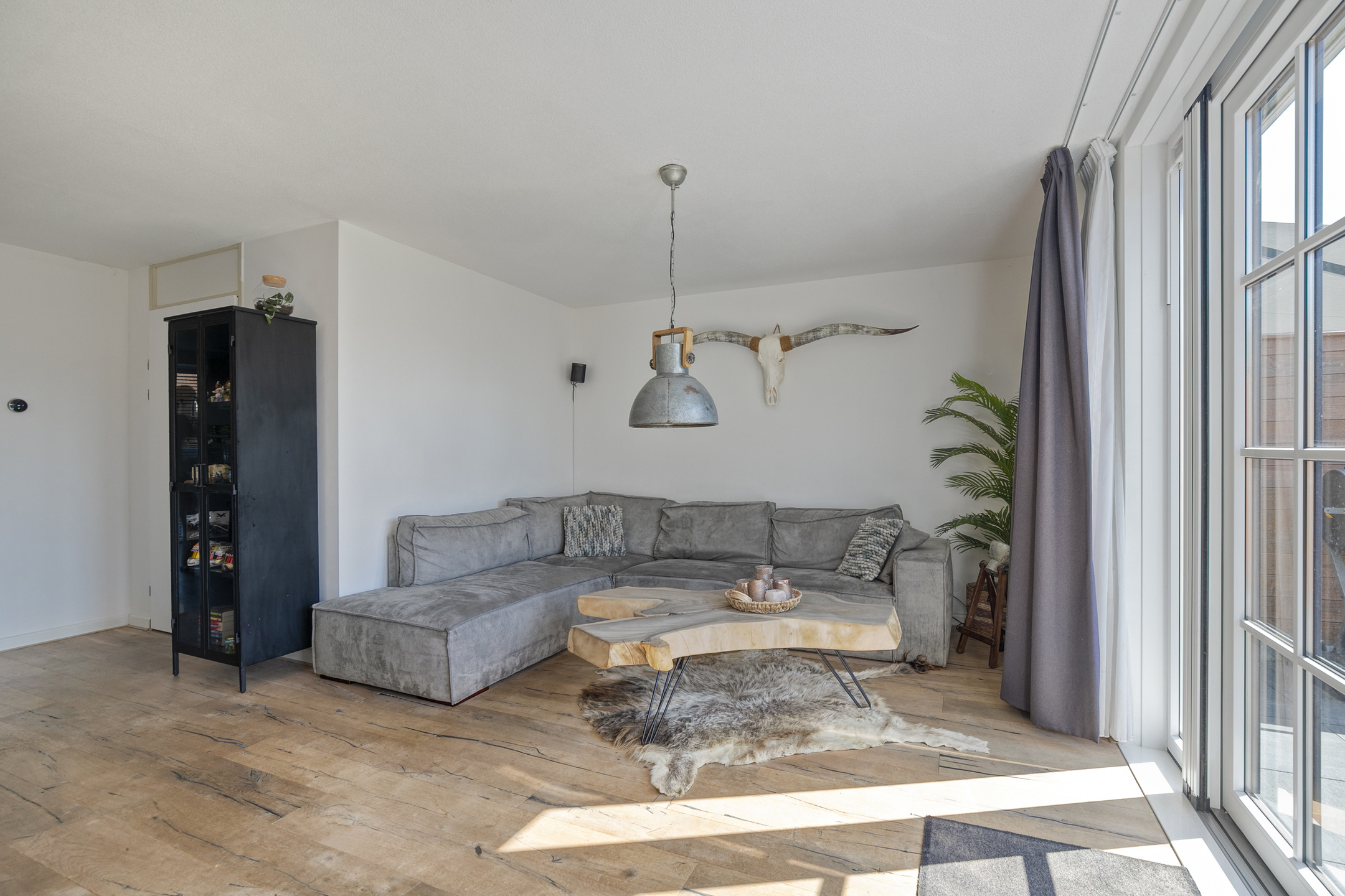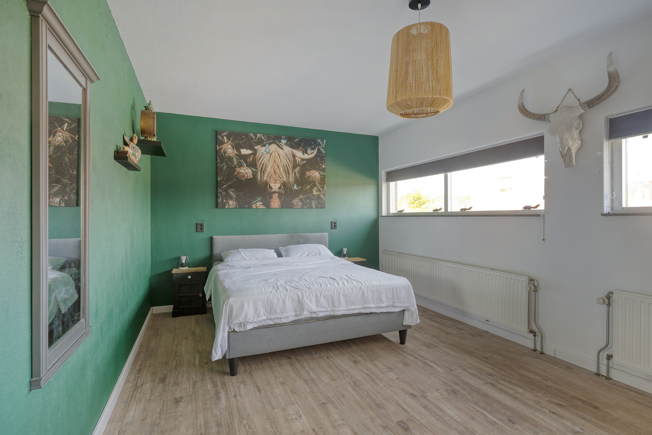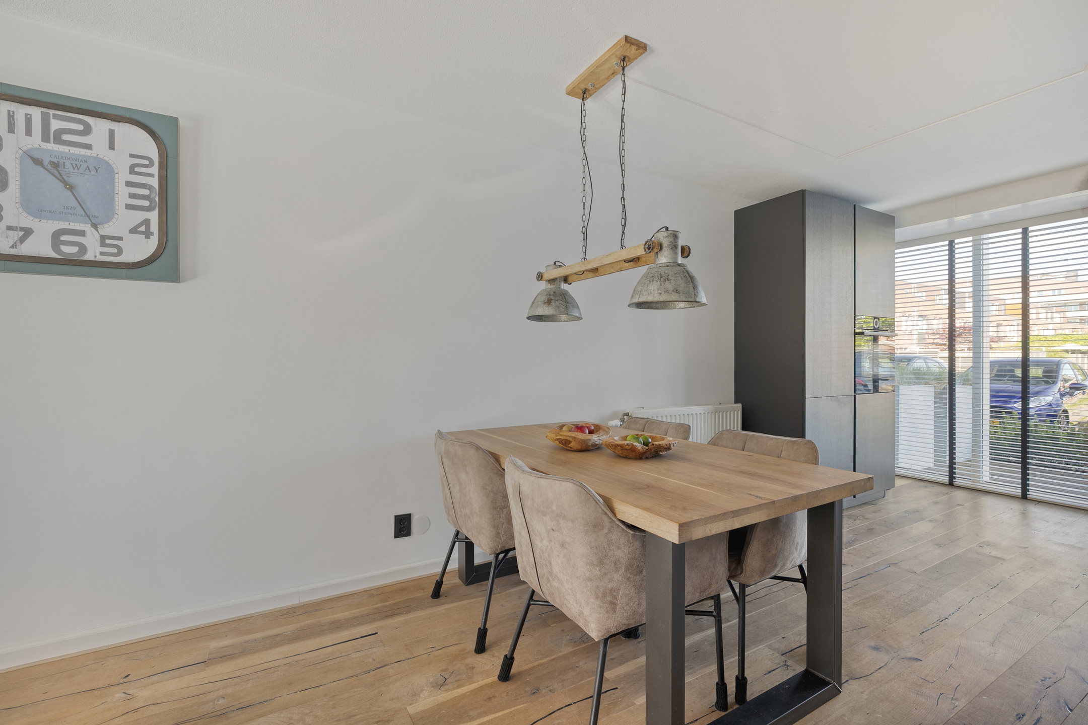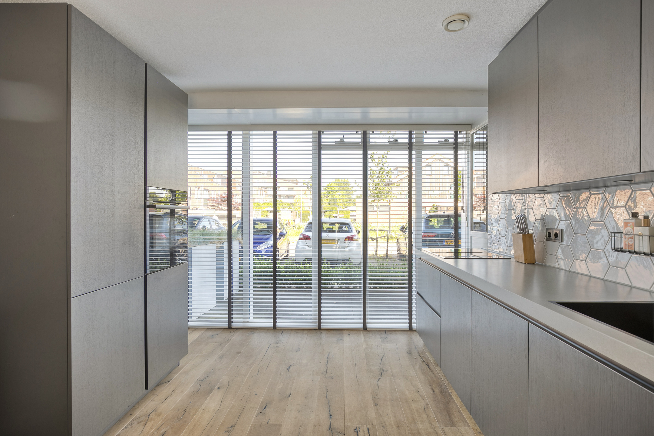 The kitchen is modern, offers plenty of storage, and is equipped with high-quality Bosch built-in appliances, including an induction hob with integrated extraction, a dishwasher, and a Quooker. Thanks to the large windows stretching across the full width of the kitchen wall, you’ll enjoy an abundance of natural light.
