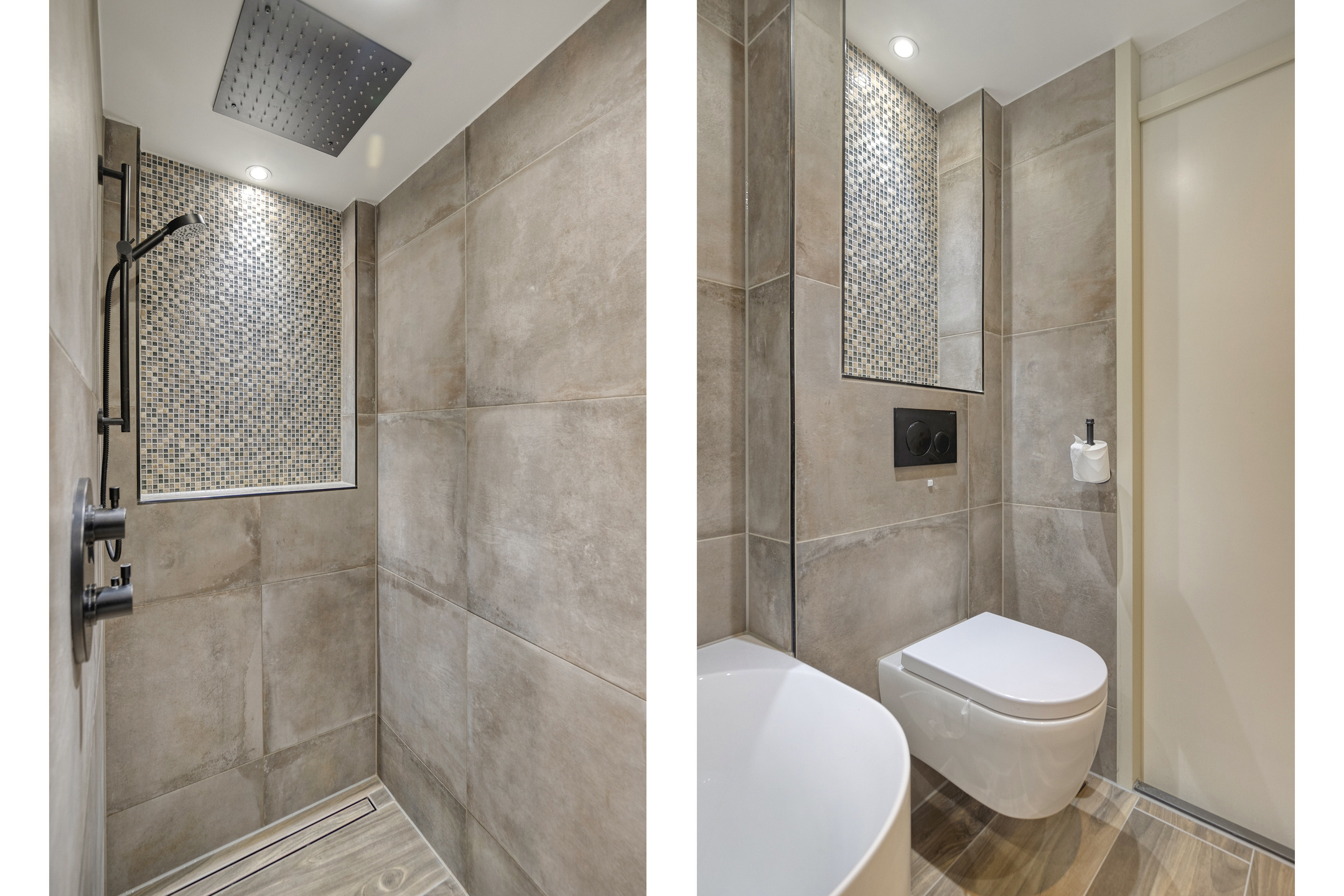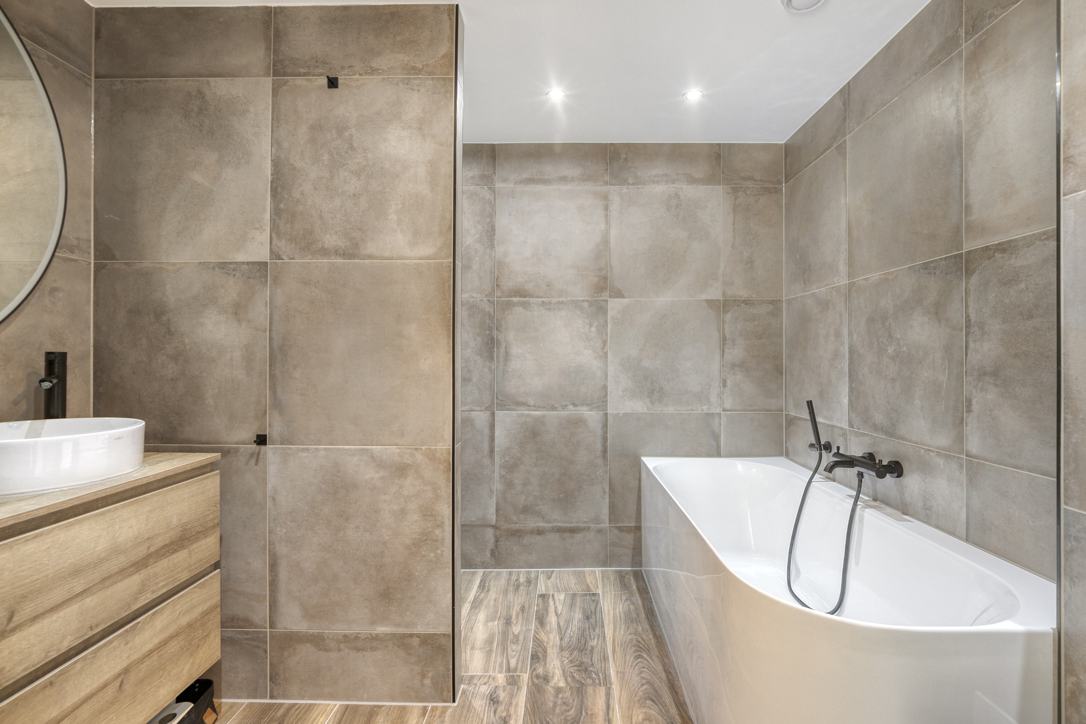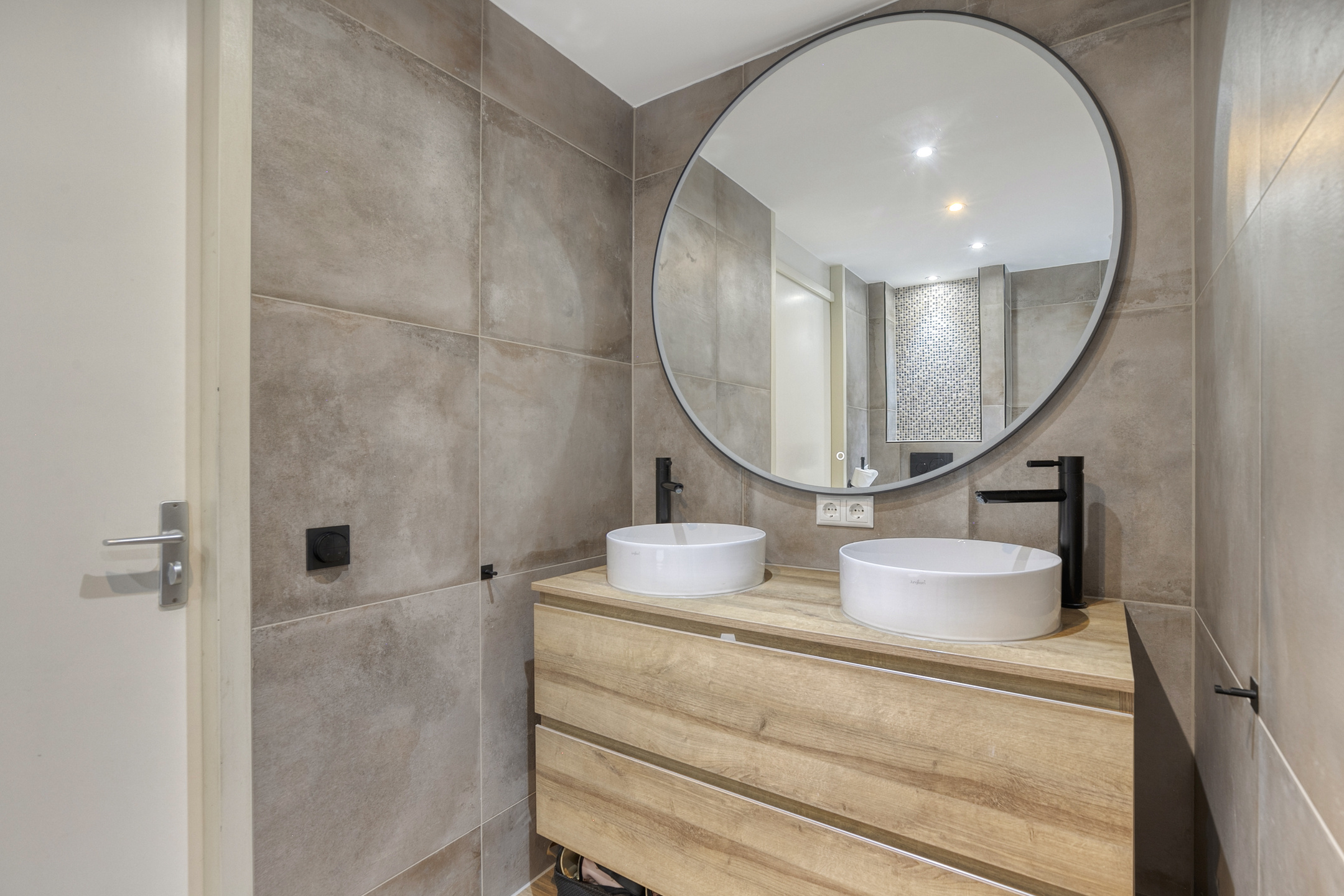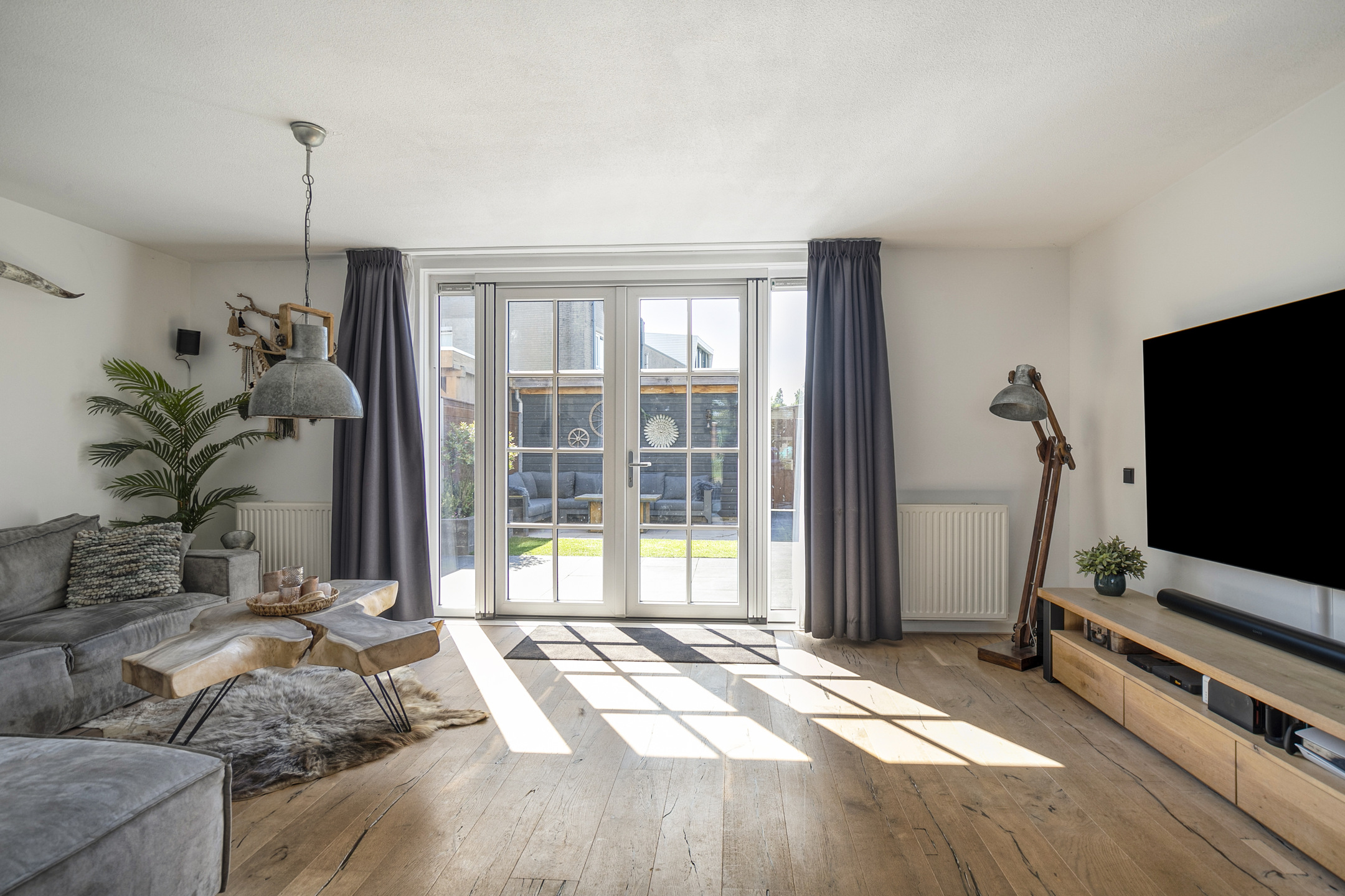 The kitchen is modern, offers plenty of storage, and is equipped with high-quality Bosch built-in appliances, including an induction hob with integrated extraction, a dishwasher, and a Quooker. Thanks to the large windows stretching across the full width of the kitchen wall, you’ll enjoy an abundance of natural light.