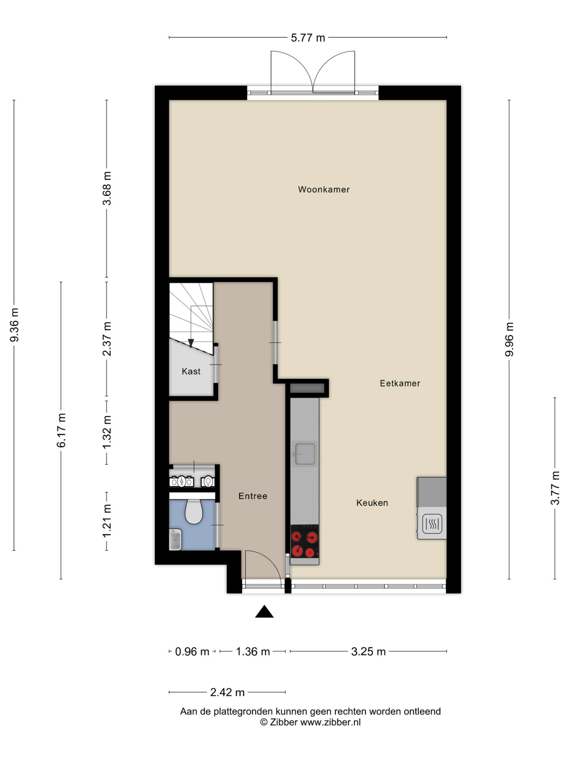 Through the front door, you enter the hallway with a toilet. From here, you step into the spacious and bright living room. Double French doors open onto the generous back garden, and there is a practical staircase cupboard. The cozy sitting area flows seamlessly into the dining space and the kitchen.