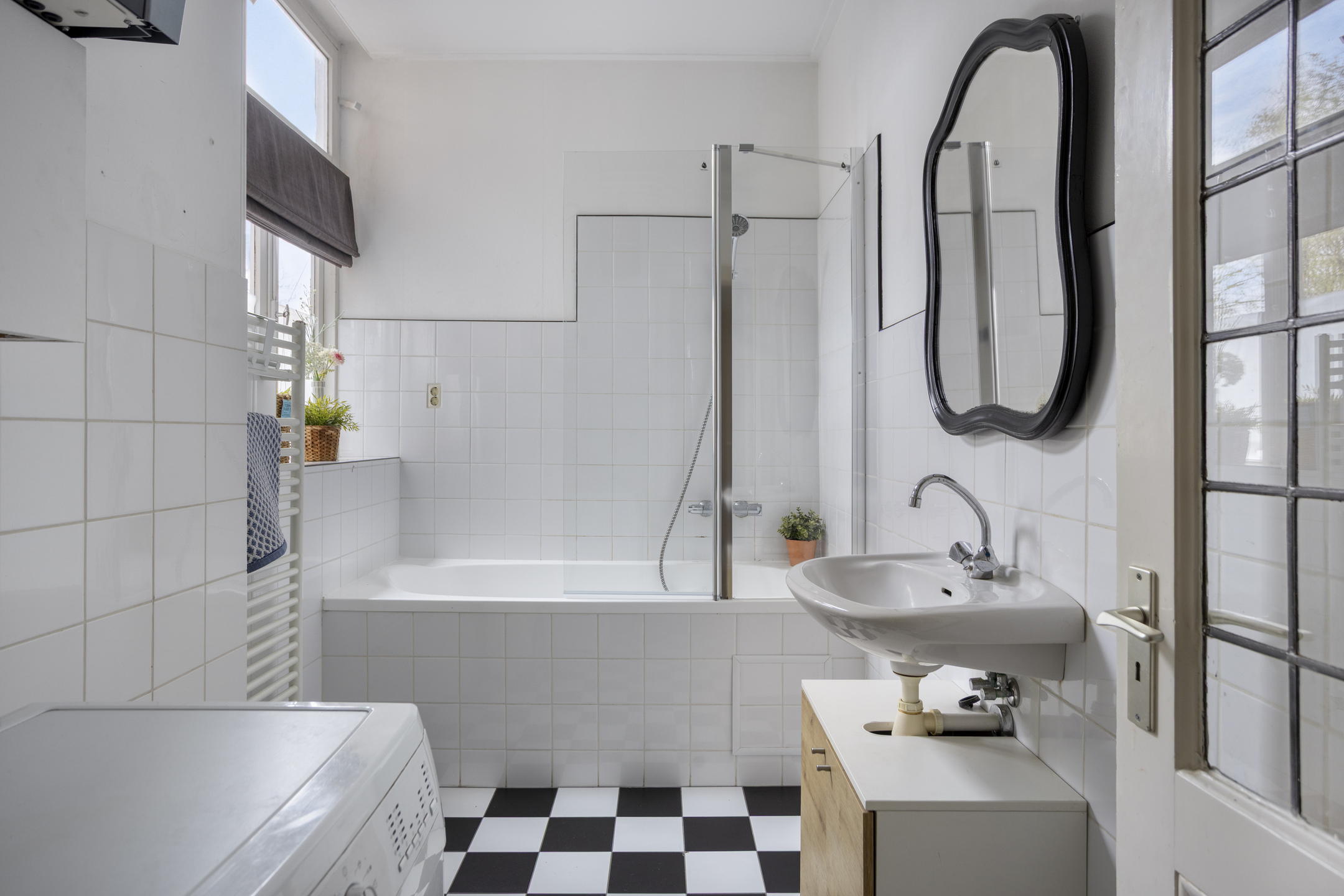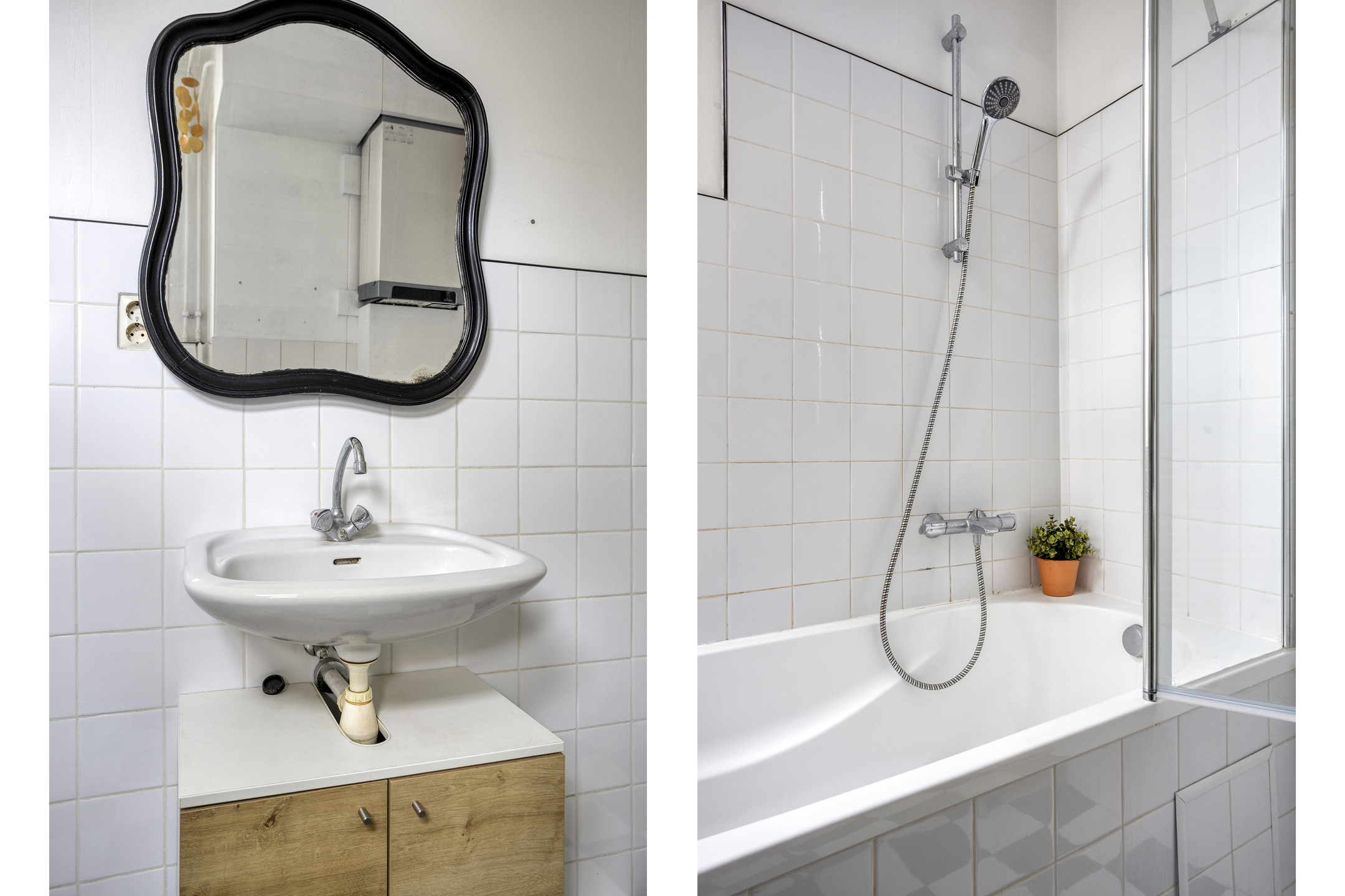 De badkamer met Franse allure is van alle gemakken voorzien. Hier vind je een ligbad met douche, een wastafel, wasmachine aansluiting en tevens de CV ketel. In de hal zit een apart toilet.