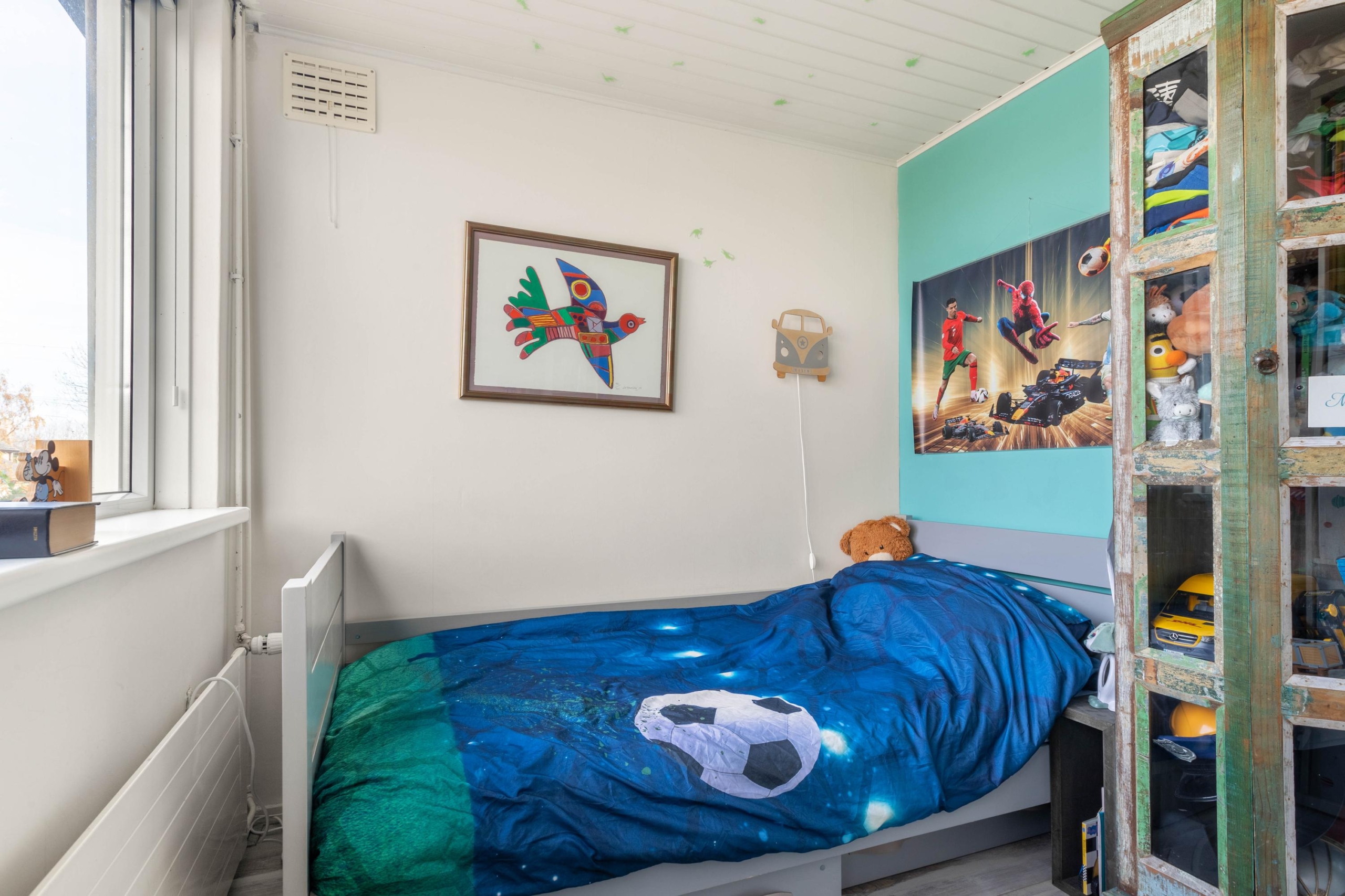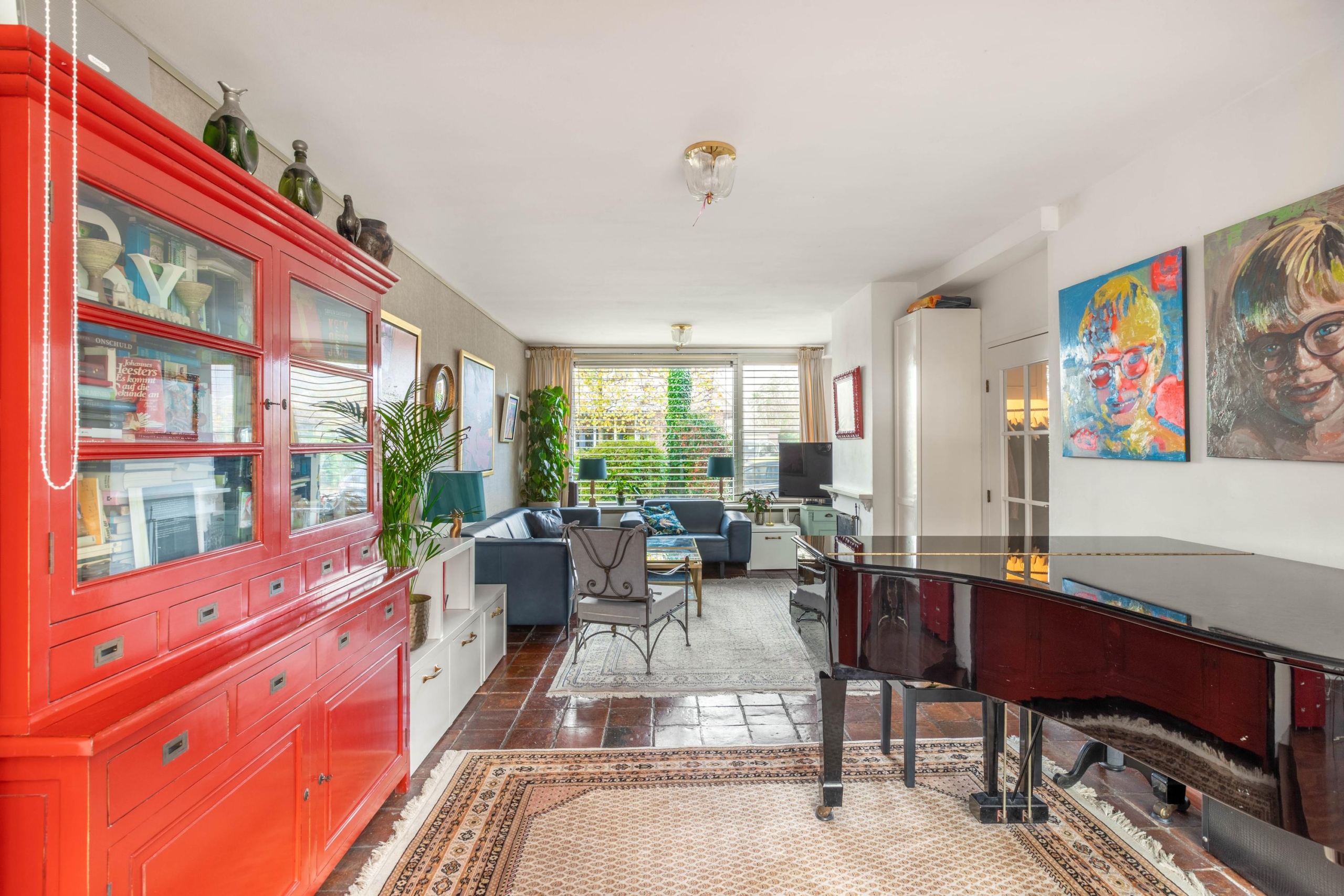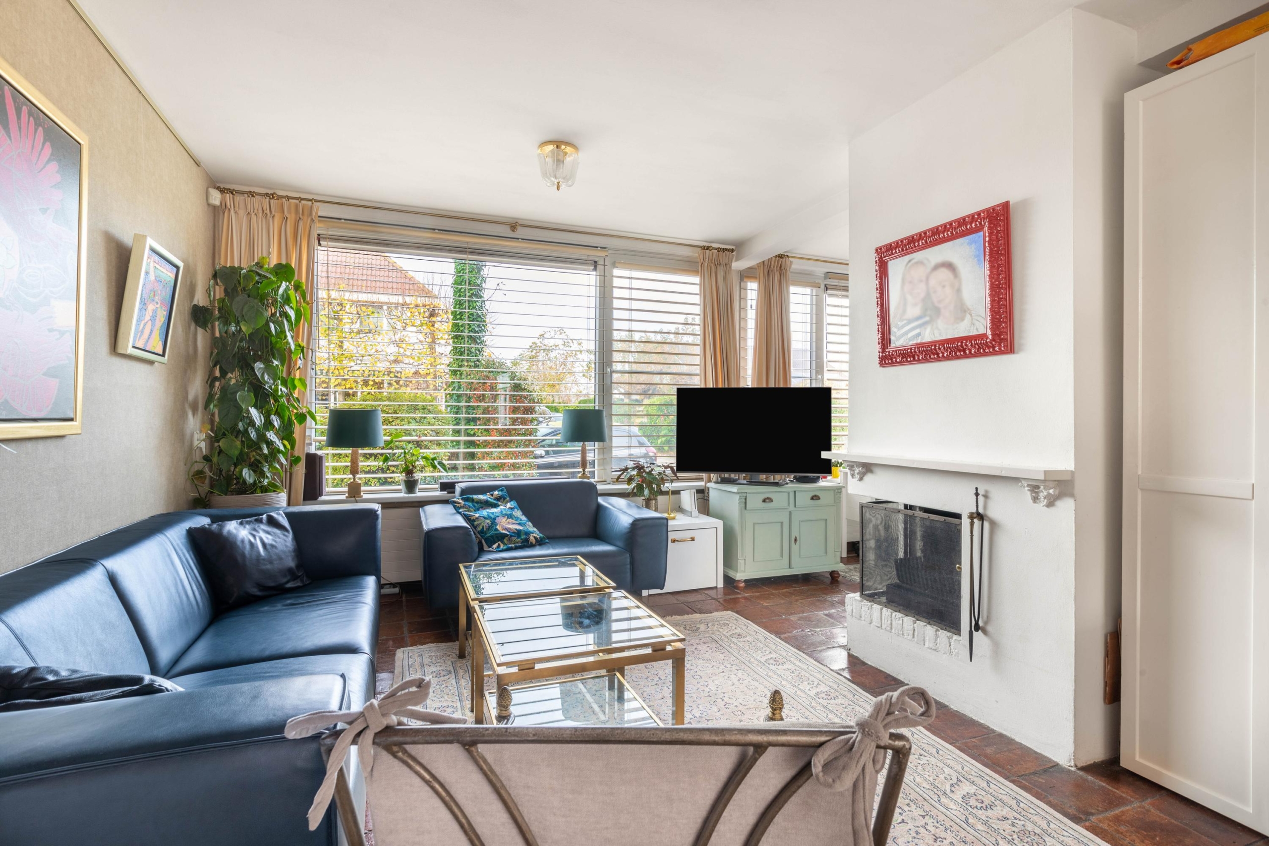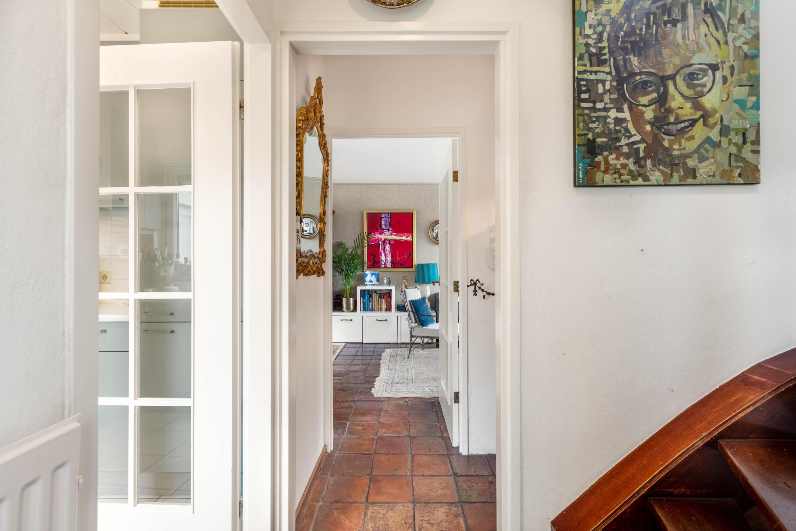 Upon entering the hall, you’ll find the meter cupboard and access to both the kitchen and living room. The living room has a playful layout, with several cozy spots to read, listen to music, or unwind. The extension has been cleverly used as a charming corner with a view of the garden. Thanks to the French doors and skylight, this space feels wonderfully bright and spacious.