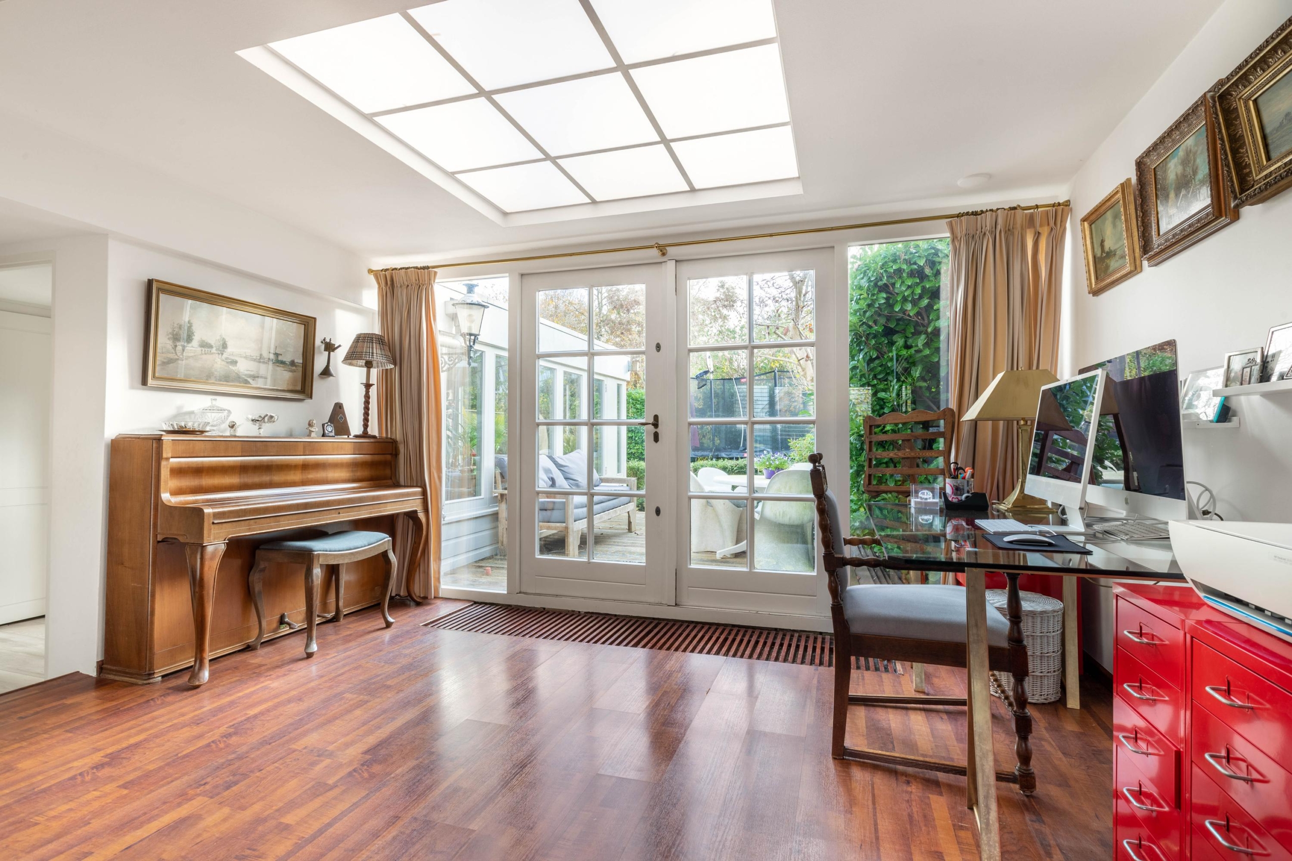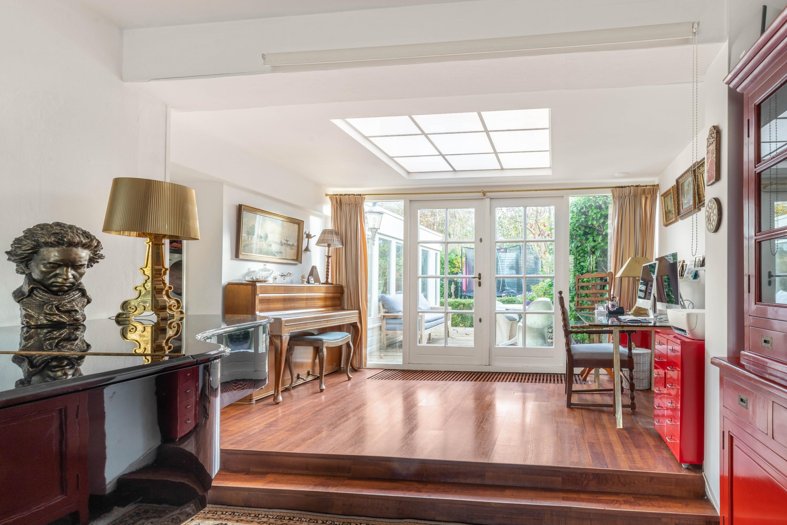 The second extension accommodates a generous dining room, easily fitting a large dining table for long evenings with family and friends. A skylight here also brings in abundant natural light and offers a lovely view of the garden. From the dining room, you can access the kitchen, which is practically designed and equipped with a 5-burner gas stove, dishwasher, and fridge-freezer. From the dining room, you can continue through to the garage which, thanks to the double doors and electrical connection, can also be perfectly used as an office or practice space.