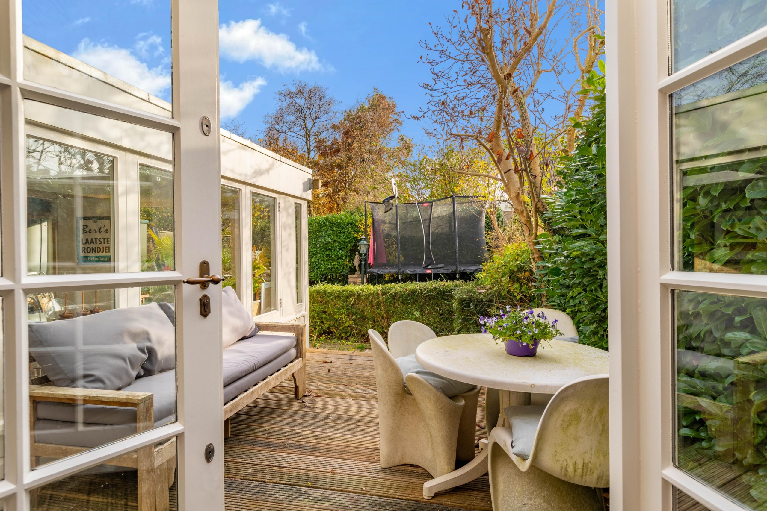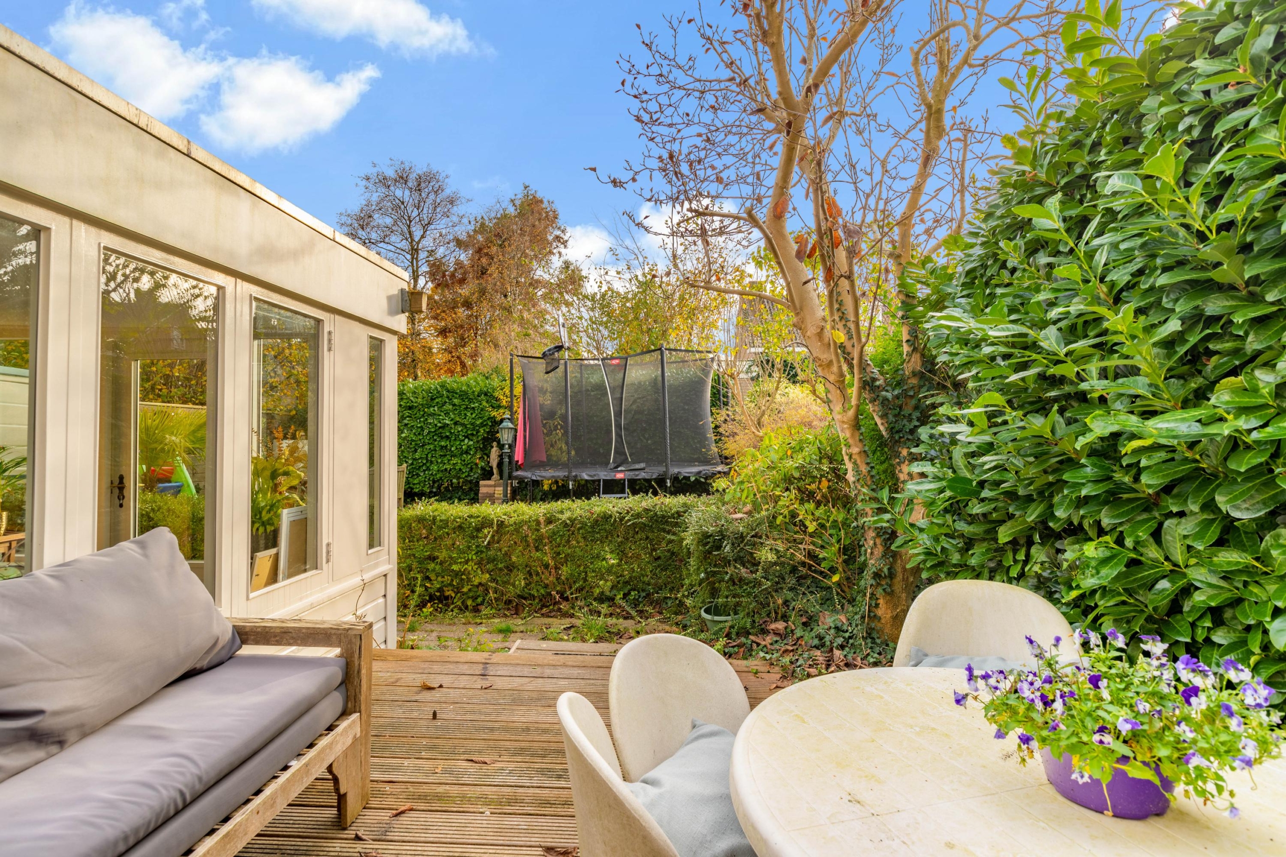 The sunny south-facing garden is surprisingly deep. With its various corners, there is space for a trampoline, a large dining table for long BBQ evenings, and a comfortable seating area to enjoy a morning coffee in the sun.