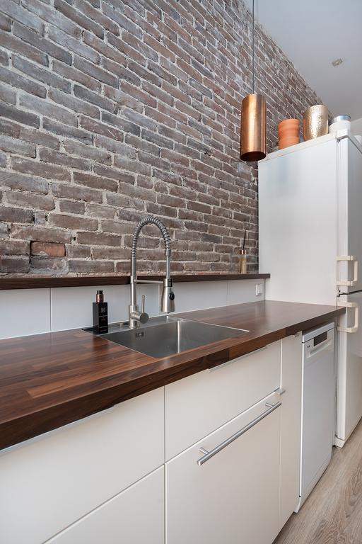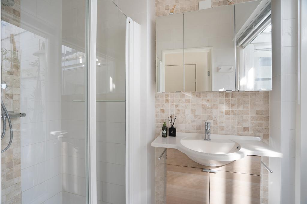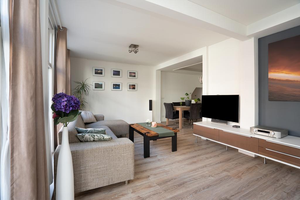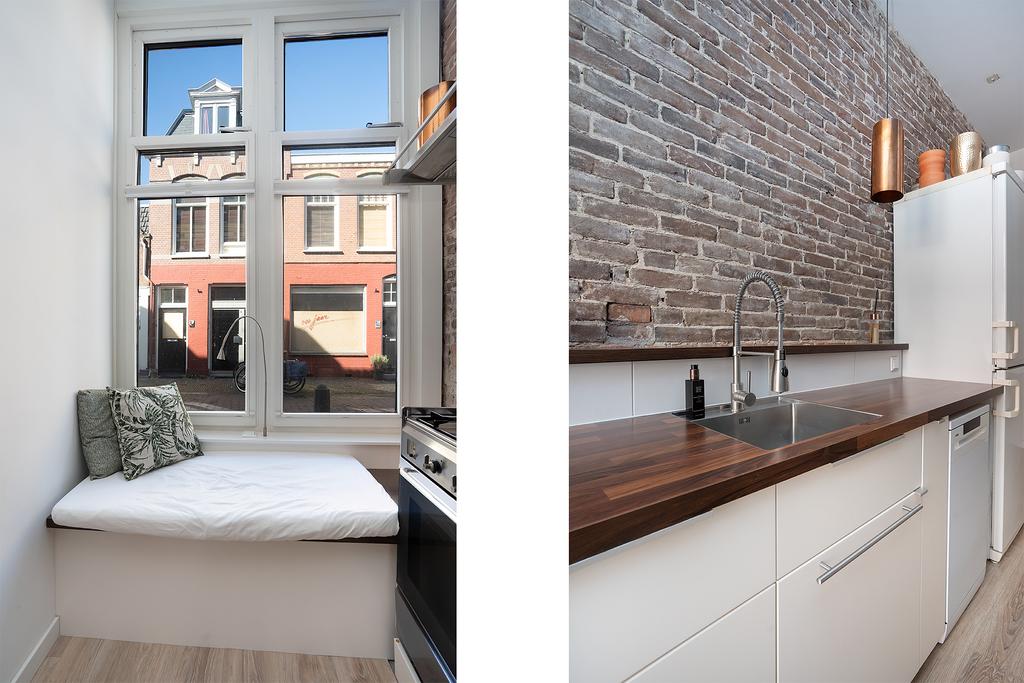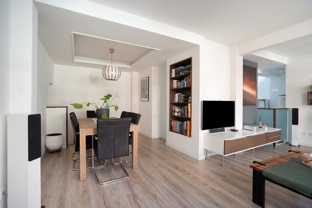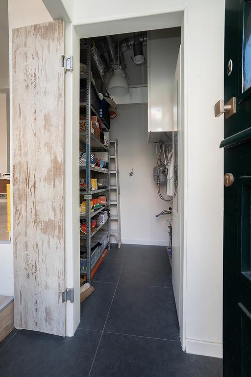 Past the dining room on the left you walk through a few steps into the kitchen. Before you enter the kitchen you will find a storage room on the left where the washing machine and dryer are installed. This spacious kitchen has a dark brown laminate top in walnut color with neutral white drawers. The kitchen has a 5-burner SMEG oven / gas stove that makes the real chef lick his fingers. The sink has a kitchen mixer tap with spray element, dishwasher and a large separate refrigerator, the kitchen has a view of the street and has a nice corner to read a book, for example, or enjoy a nice espresso or coffee in the morning.