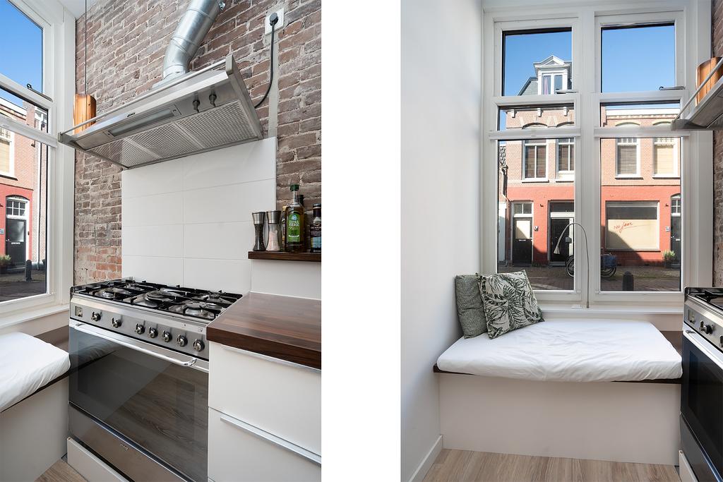 Voorbij de eetkamer links loopt u doormiddel van een paar treden de keuken in. Voordat u de keuken betreedt vindt u links een berging waar de wasmachine en droger zijn geïnstalleerd. Deze ruime keuken heeft een donkerbruin laminaatblad in walnootkleur met neutrale witte lades. De keuken heeft een 5-pit SMEG oven/gasstel waar de echte kok zijn vingers bij aflikt. De spoelbak heeft een keukenmengkraan met sproei element, vaatwasser en een ruime losse koelkast, de keuken heeft uitzicht op de straat en heeft een fijne hoekje om bv. een boek te lezen, of te genieten van een lekker espresso of koffie in de ochtend.