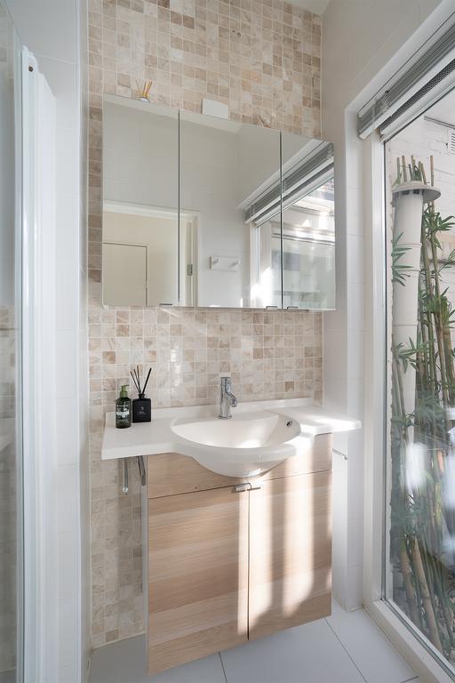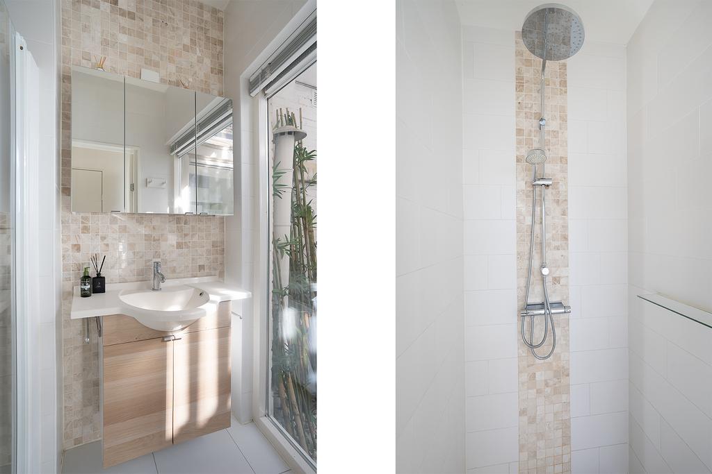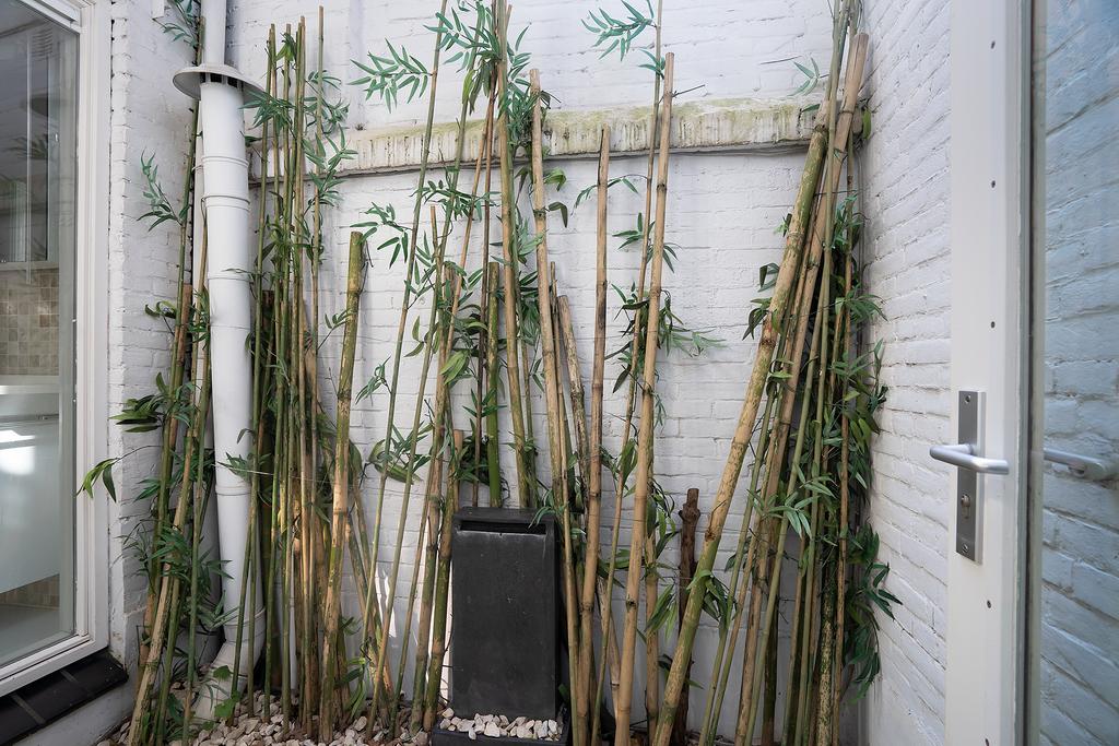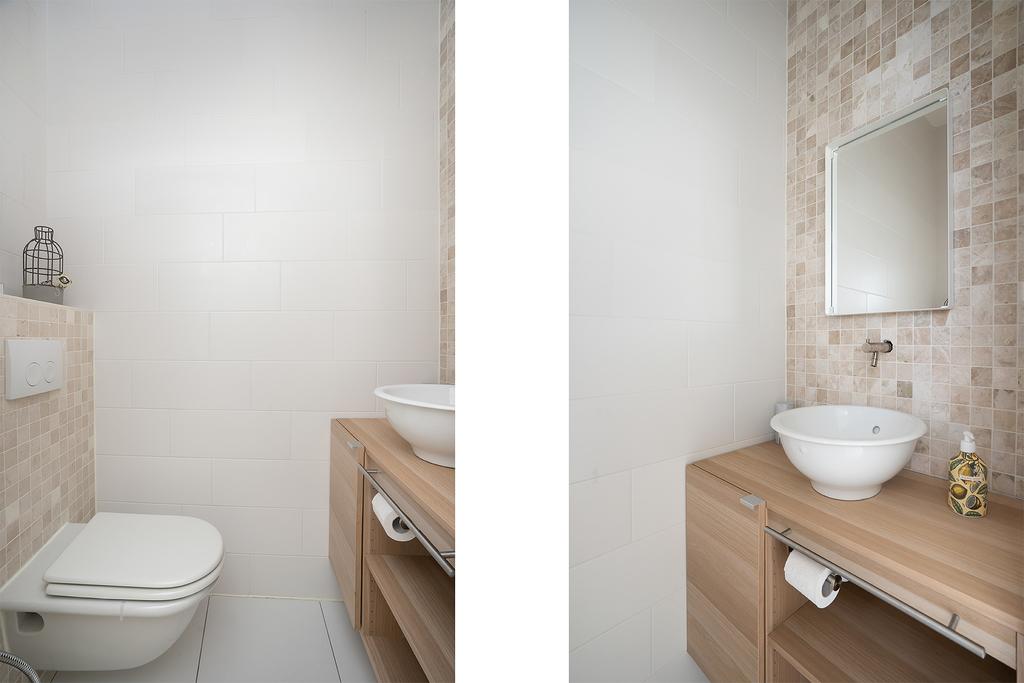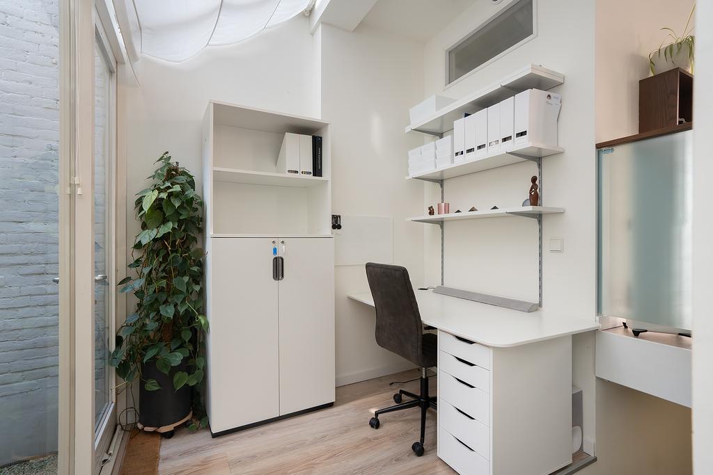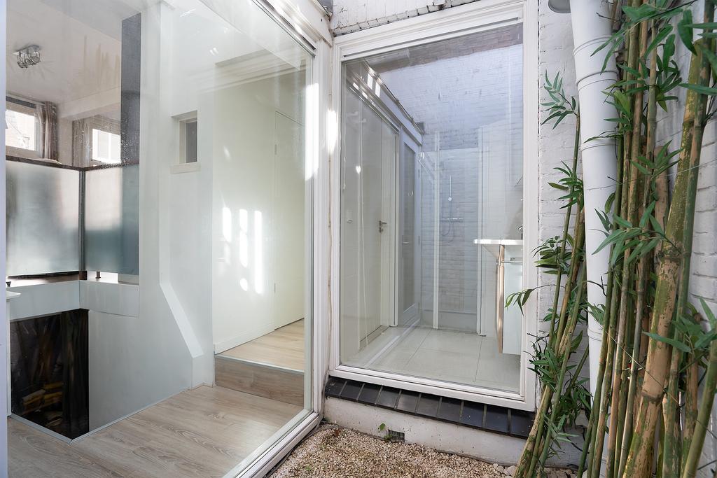 Through the entrance, storage room, you enter the hall which provides direct access to the living room via a small step. The living room has a spacious layout and offers plenty of natural light, the living and dining area creates an open and pleasant atmosphere. The house is finished to perfection with white stucco and oak laminate, which immediately gives the house a warm feeling. Along the dining room on the right you can find the separate toilet, with washbasin and bathroom. From the bathroom you have a view of the patio garden of the house, which is covered with bamboo. The bathroom has a walk-in shower with rain shower, washbasin and is finished with mosaic tiles in warm earthy colours. Along the bathroom you will find a small space that can be used as an office / home workplace and gives access to the patio garden.