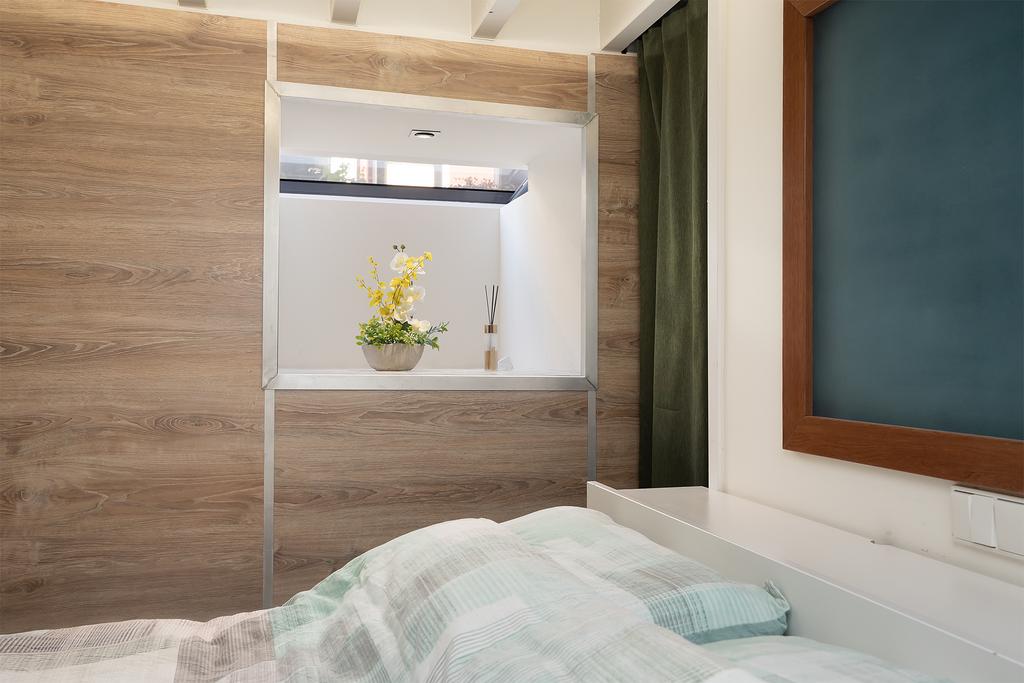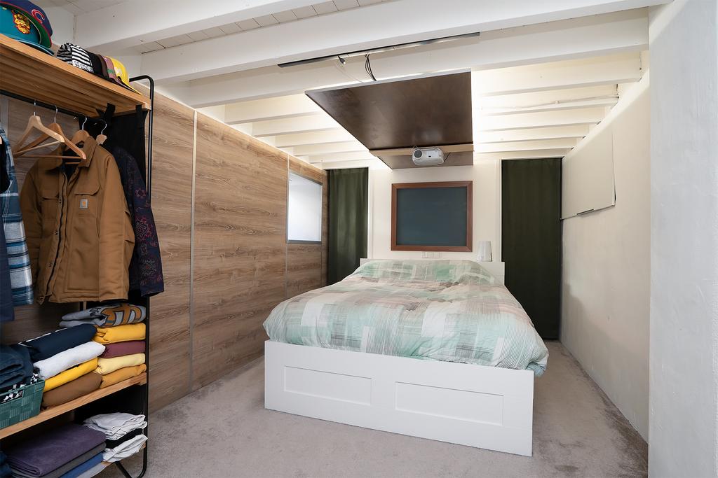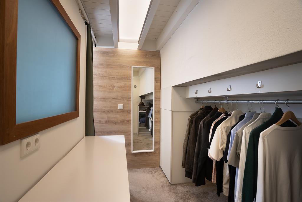 Past the bathroom you can find the bedroom with the stairs down. The bedroom is spacious and you can place a large bed here. At the end of the bedroom, the space is split in two by a small room divider. The second space created by this is a spacious walk-in closet. The bedroom also has a real home cinema for many evenings of movie fun.