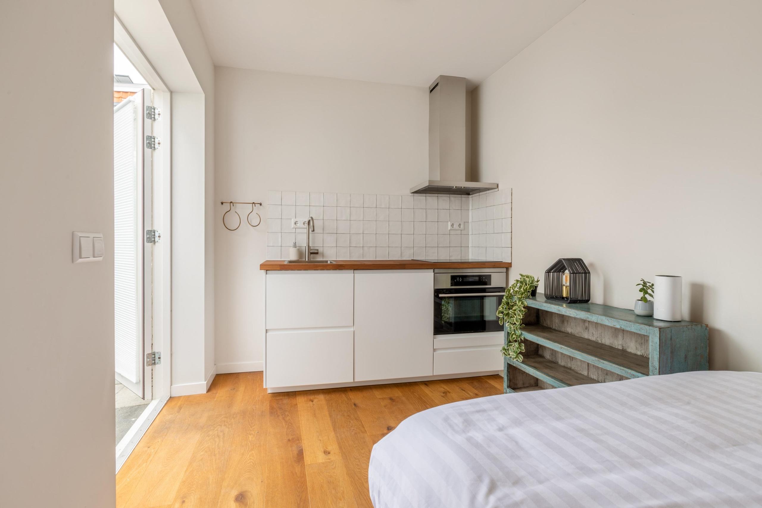 Through the double French doors, you walk into the sunny backyard, where you can also easily enter the guesthouse. This room has everything you need to rent it out, but also to provide guests with private accommodation. By everything, we really mean that everything is present. A private kitchen with cooking facilities, space for a large double bed, and also a private bathroom with rain shower and toilet. The garden also has a spacious storage shed, with a separate entrance from the street side, so that guests of the guesthouse do not have to pass through the house.
